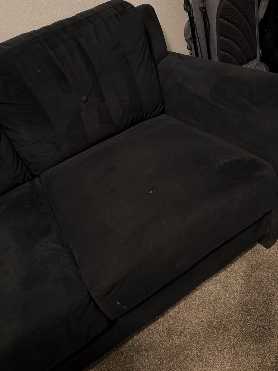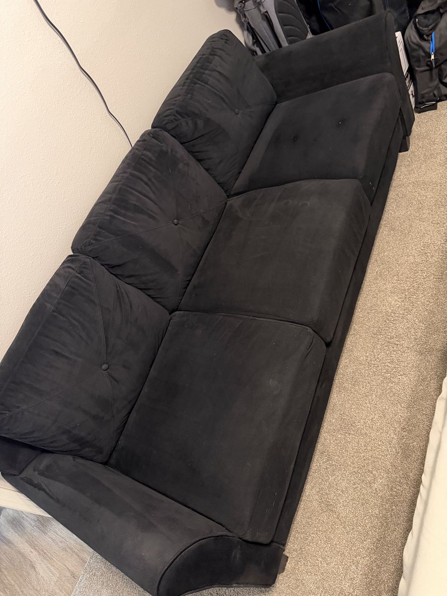 Black futon couch originally purchased for $395. Still in great structural condition – cushions are firm and comfortable. Has some cosmetic staining from normal use (reflected in price). Perfect for apartment, guest room, or starter setup.