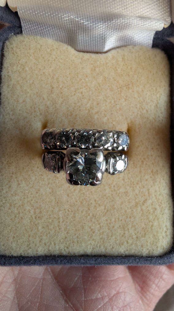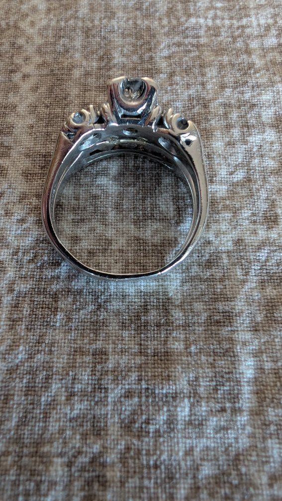 This beautiful 1930s vintage wedding set features an elegant engagement ring centered with a beautifully raised Old European cut diamond, accented by additional side stones that create a balanced and sophisticated silhouette. A charming detail of the setting is the heart-shaped corner prongs holding the center stone, adding a subtle romantic touch rarely seen in modern rings.