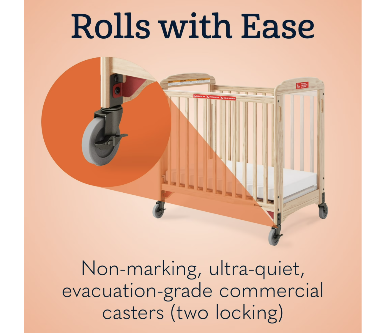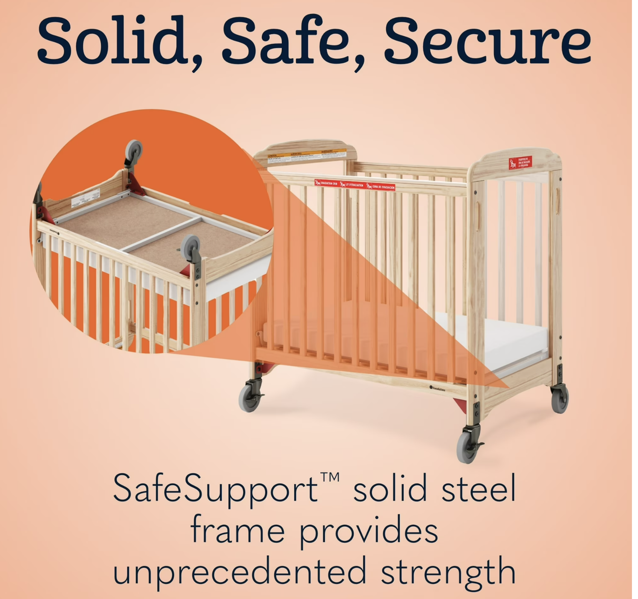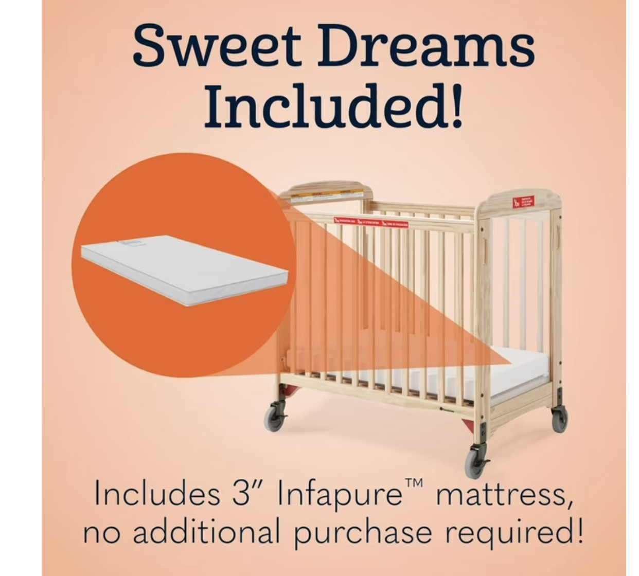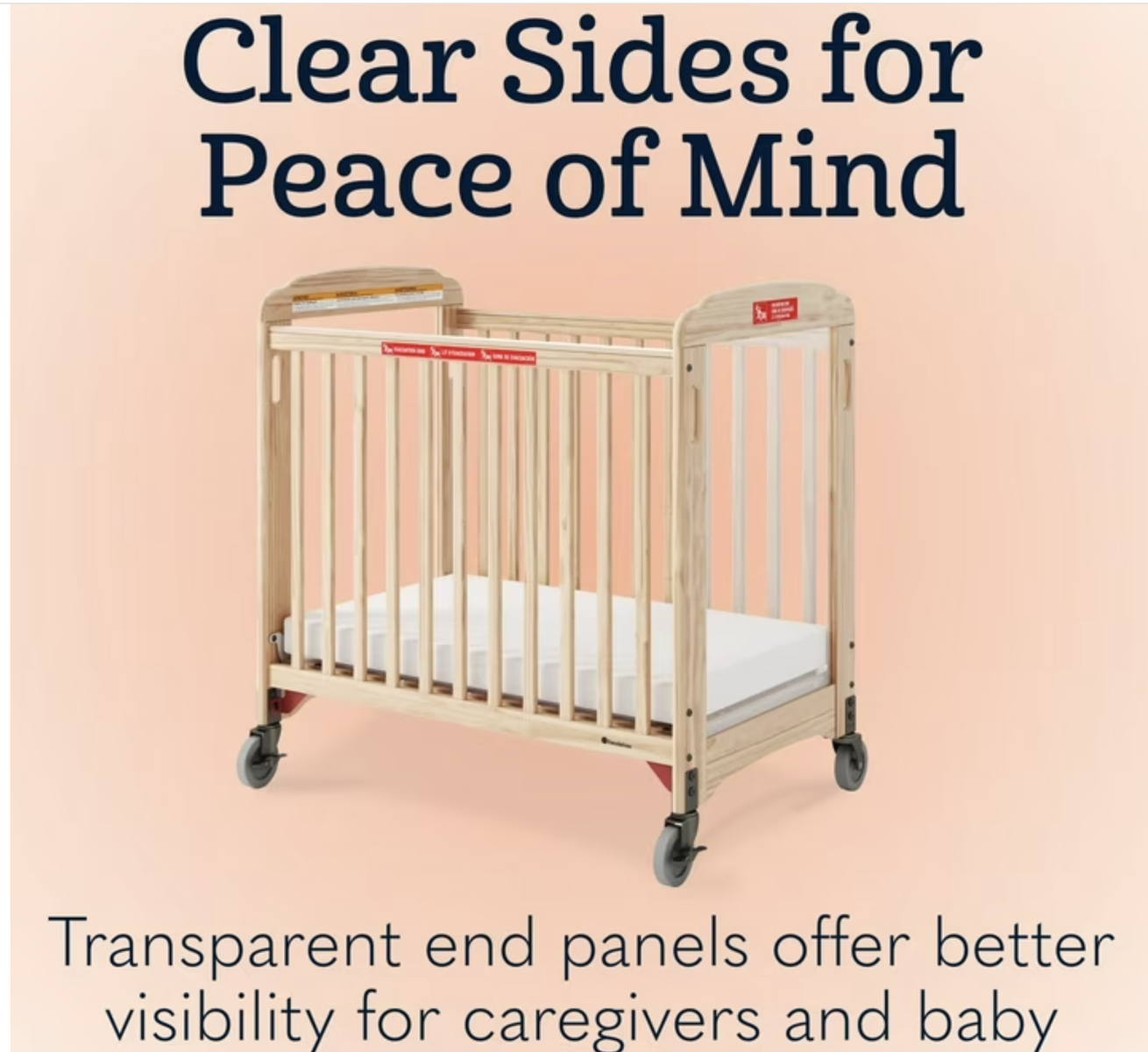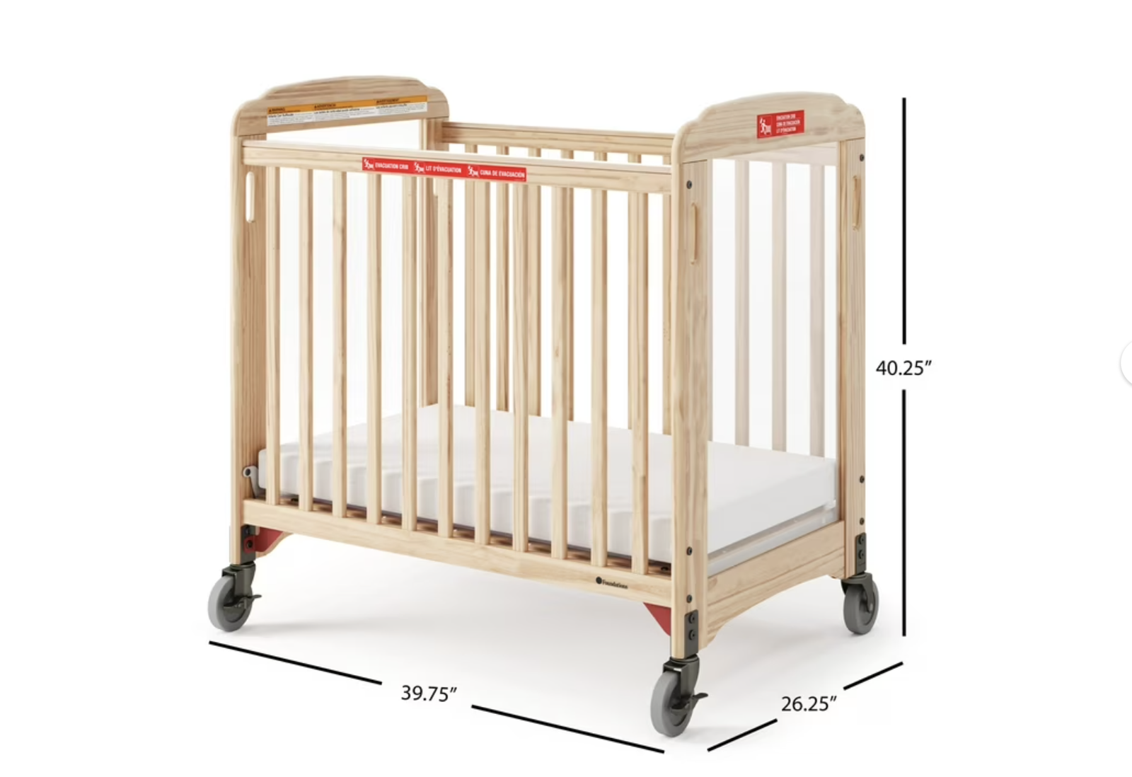crib features easy-grip handles that are built into the headboard to aid in stable transportation by caregiver from room-to-room. Each leg of the Foundationr Fixed-Side Crib with Clearview Panels features a non-marking 4-inch oversized caster (2 of which are locking casters). For additional stability, this crib includes a solid steel frame which provides a smooth transition when moving from room-to-room. Both end panels are Clearview Panels for added visibility of your child. This crib comes included with a 3-inch Ultradurable Foam Mattress. The natural wood finish of the crib means that it will blend perfectly with other nursery furnishings. . The dimensionsare as follows: 39.33” L x 26.25” W x 40” H, with a weight of 45 pounds.