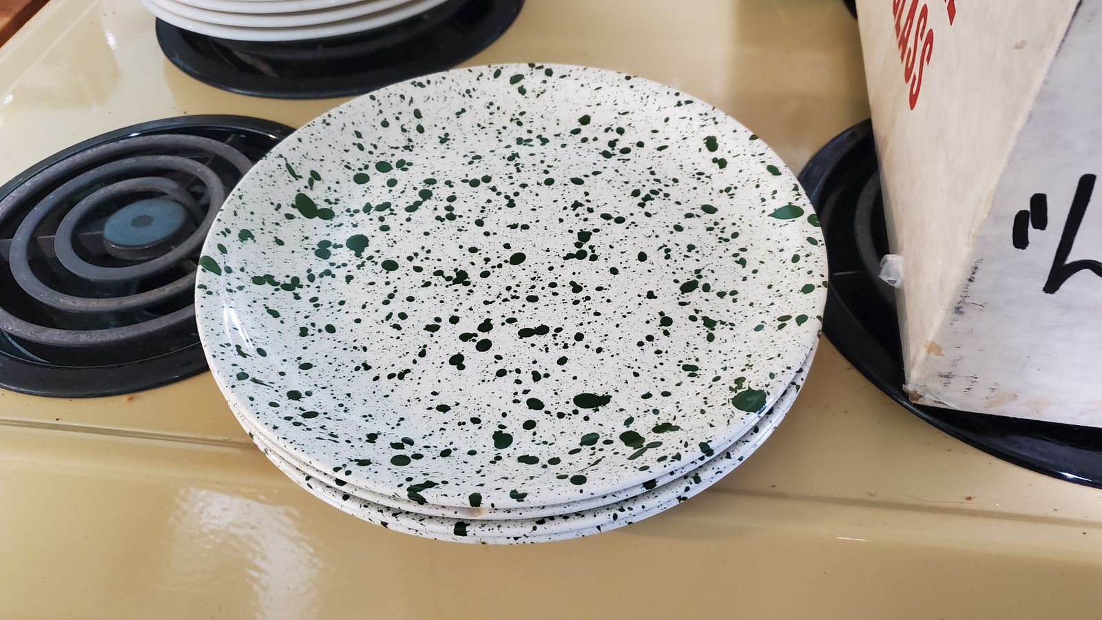 This is a set of four Paden City Pottery plates in their discontinued "Confetti Green" style.