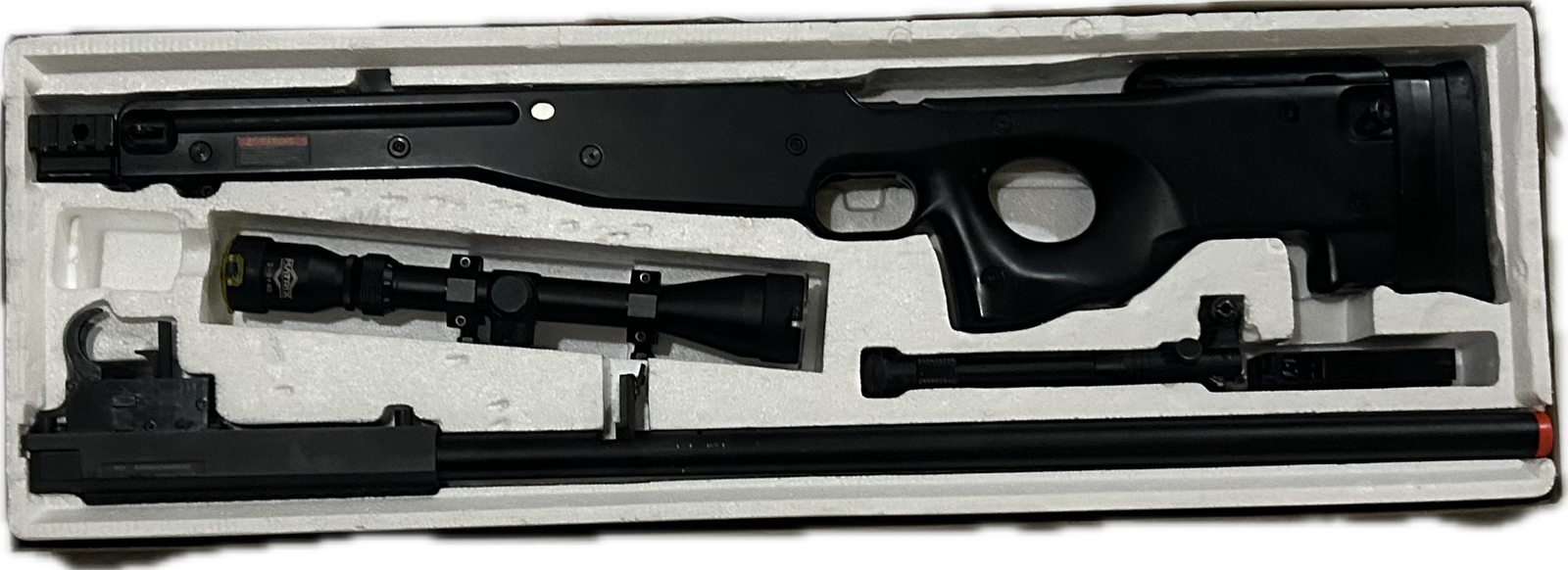 MB01 sniper rifle. It has served me well in many games where I've shot glasses, shoes, fingers, crotches, and running targets on multiple occasions. It can shoot targets up to 75 yards out. Feel free to text me with any questions you have. Comes with scope and bipod.