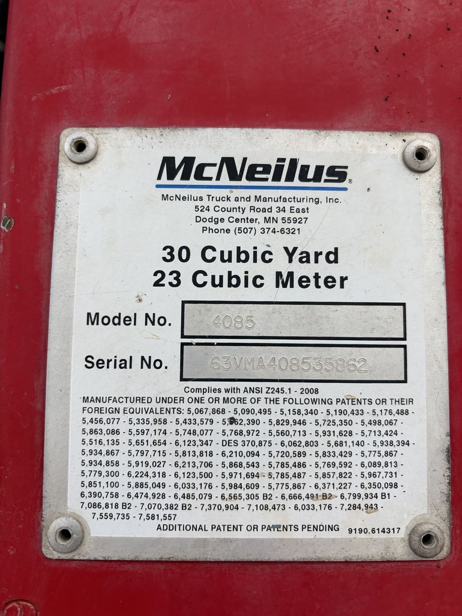 2012 Mack MRU633 6x4 Front Loader Waste Collection garbage Truck 252,000 miles • Cummins ISL CNG Motor • Allison Automatic • 20,000 lbs front axle • 40,000 lbs rear axles • McNeilus 30 yd Capacity Collection Body • Air Brakes • Differential Lock • Side/Rear Cameras Truck is in good condition, all sensors, cameras, lights and indicators work correctly. Has some rust on the lower edges of McNeilus body. Have videos of all the hydraulics working