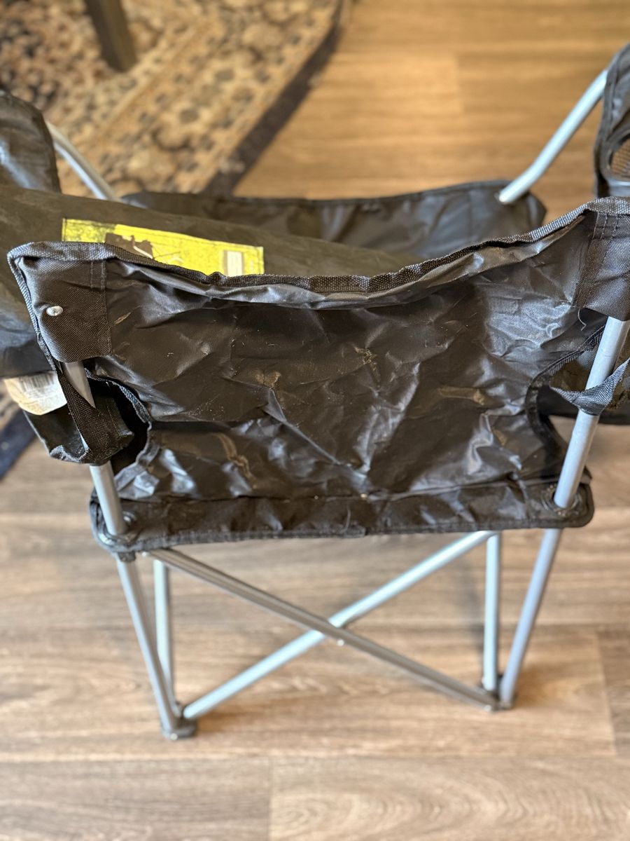 Set of 2 Ozark Trail chairs. Nothing fancy, just solid, reliable camping chairs. Easy to fold and bring anywhere. Good for camping, BBQs, or just keeping in your car. One has a snag, see photo.