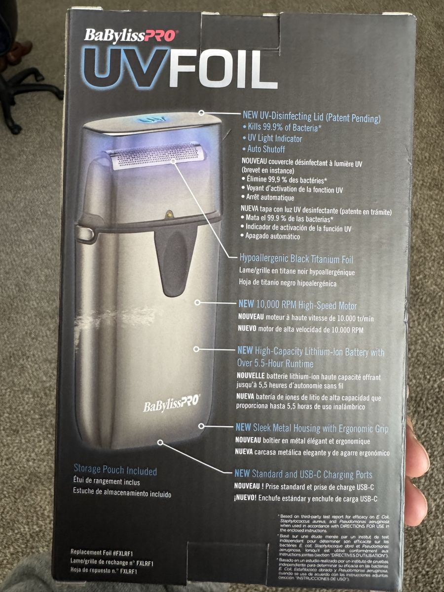 Features NEW UV-Disinfecting Lid Kills 99.9% of Bacteria UV Light Indicator Auto Shutoff Hypoallergenic Black Titanium Foil NEW 10,000 RPM High-Speed Motor NEW High-Capacity Lithium-Ion Battery with Over 5.5 Hour Runtime NEW Sleek Metal Housing with Ergonomic Grip NEW Standard and USB-C Charging Ports Includes Storage Pouch