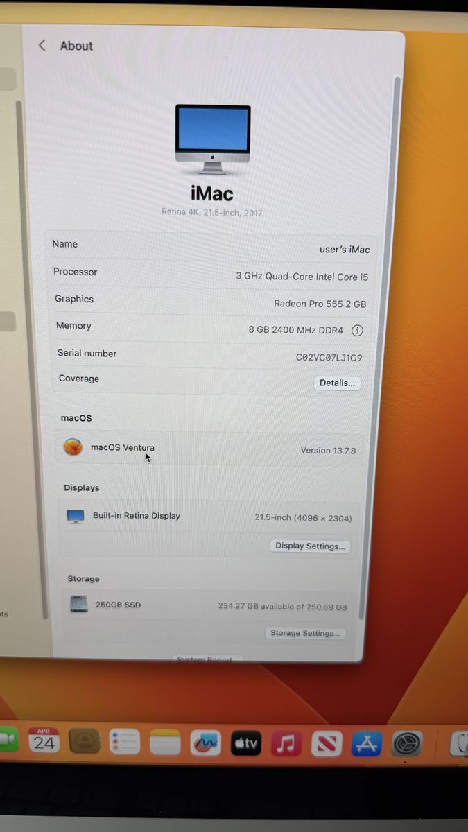 2017 iMac 21.5” 4K Display macOS Ventura Intel Core i5 3.0 GHz Quad Core Processor 8GB DDR4 RAM Radeon 555 Graphics 2GB 250GB SSD 2 Thunderbolt (USB-C) Ports 4 USB 3.0 Ports Gigabit Ethernet WiFi / Bluetooth