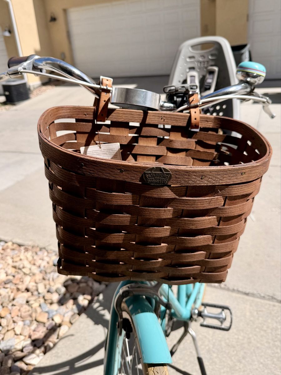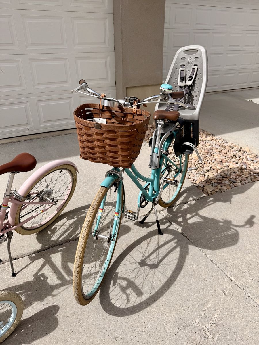 BIKES $150 — PUBLIC C1 (Turquoise) (Retail $500) Classic step-thru cruiser. Comfortable + lightweight. Leather seat and grips. Note: cosmetic wear from regular use and transport. Includes rear rack, cup holder, bell + large Peterboro handcrafted basket (retail $120).