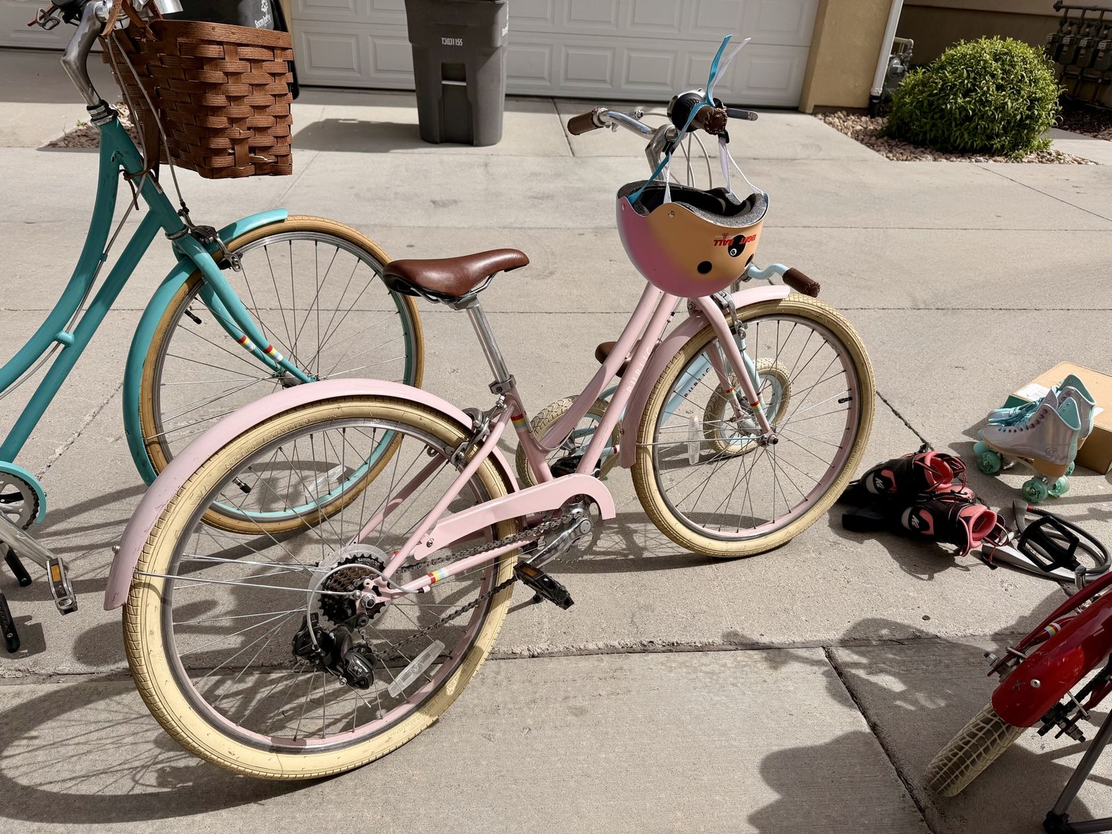 $150 — PUBLIC C7 24” (Pink, 7-speed) (Retail $500) Great “first adult bike” with smooth gears for kids. Leather seat and grips. Note: visible wear, priced accordingly.