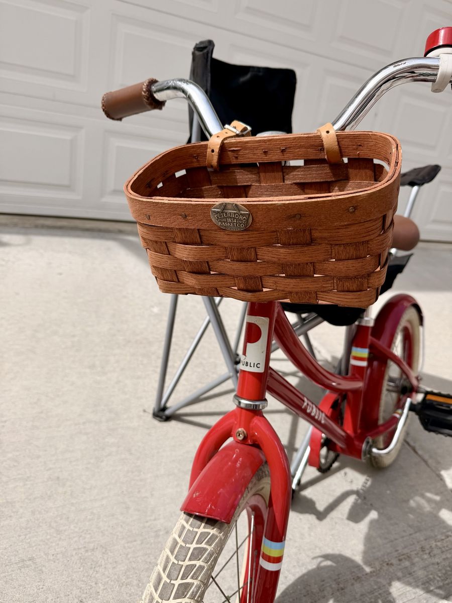 $100 — PUBLIC Sprout C 16” (Red) (Retail $330) Easy step-through kids bike. Includes child-sized Peterboro handcrafted basket (retail $110). Leather seat and grips.