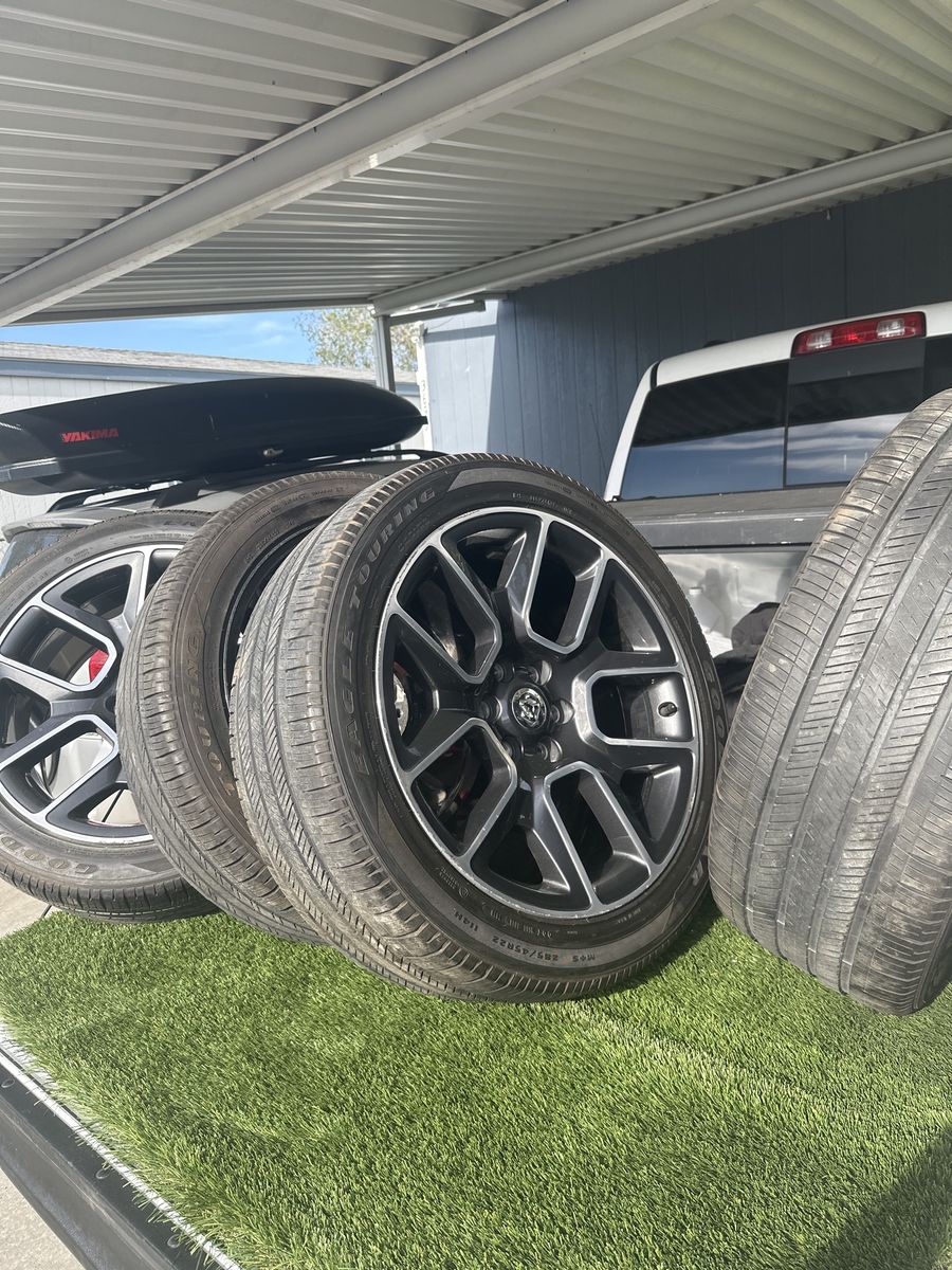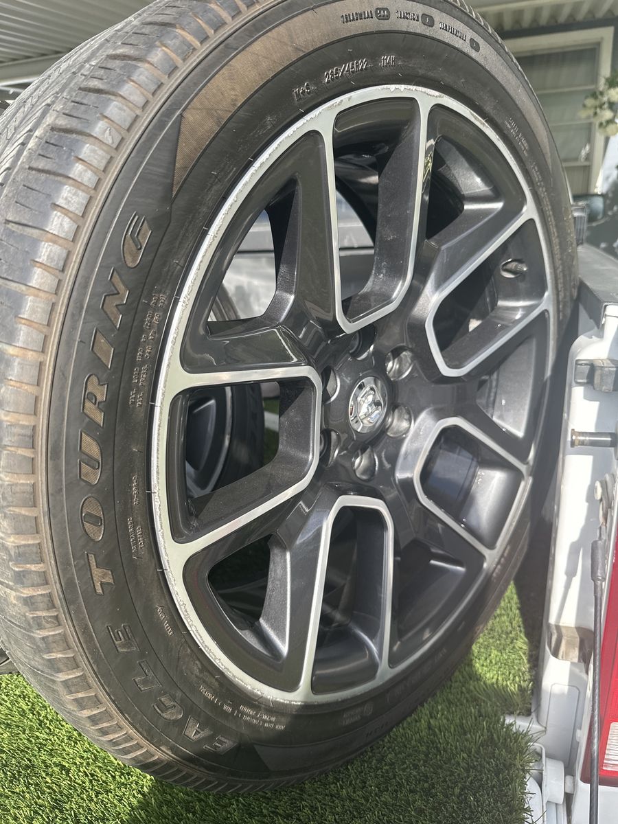 ZelleRims and tires for a 2019-and-newer RAM 1500. They are in good condition, feature a 6-lug pattern, and were removed from a 2025 RAM RHO. Two of the tires have little life left, and two have half.
