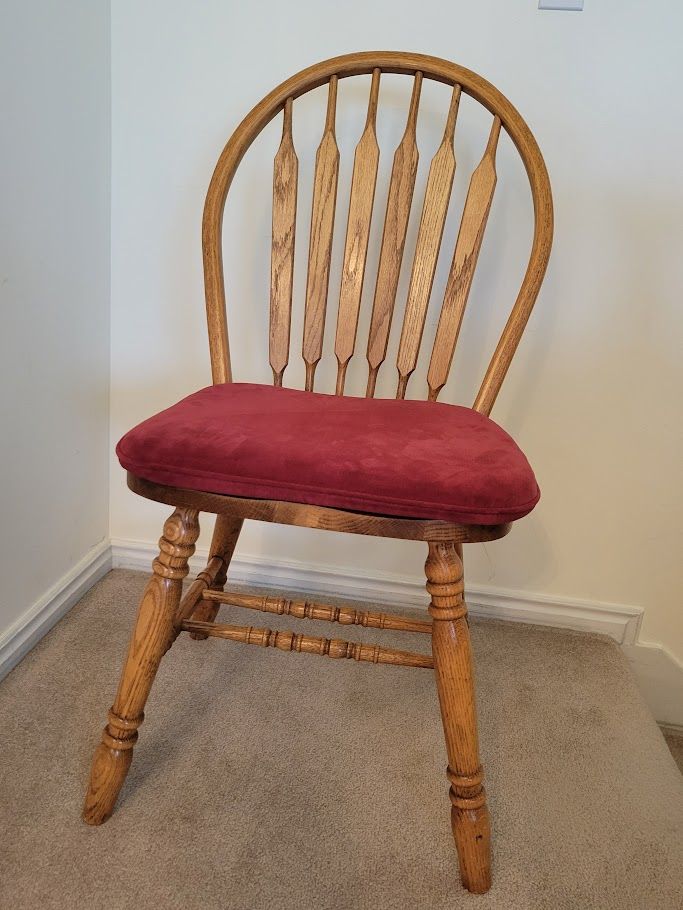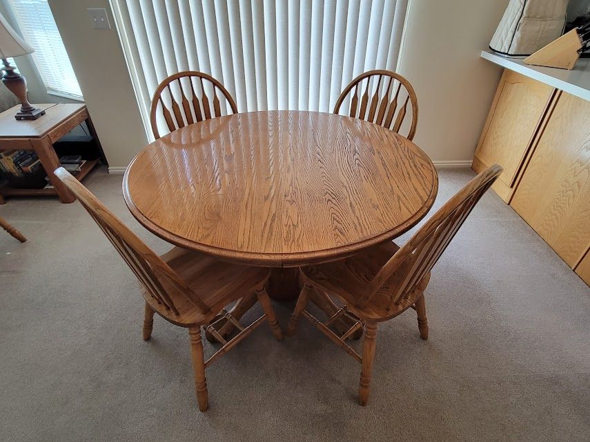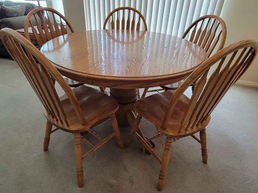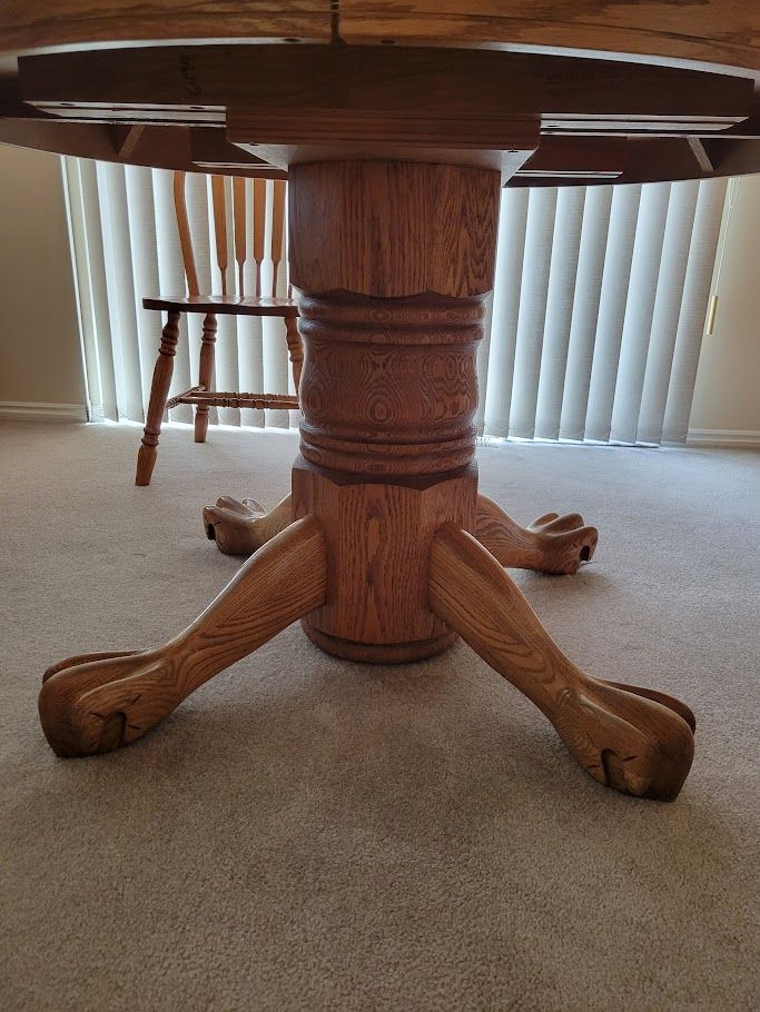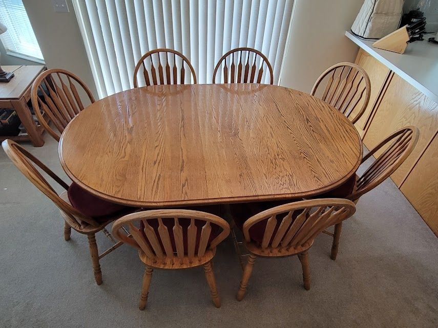 VenmoBeautiful solid oak pedestal dining table and 8 chairs. Extendable table 72" x 48" - Comfortably seats 6-8. With the leaf removed 48" diameter round - Comfortably seats 4-5. Table and all chairs in good, sturdy condition. Finish is a bit worn in spots, but can be refinished. It looks nice if polished with Pledge regularly. Also, 8 burgundy chair pads with ties - easily spot cleaned with a damp cloth.