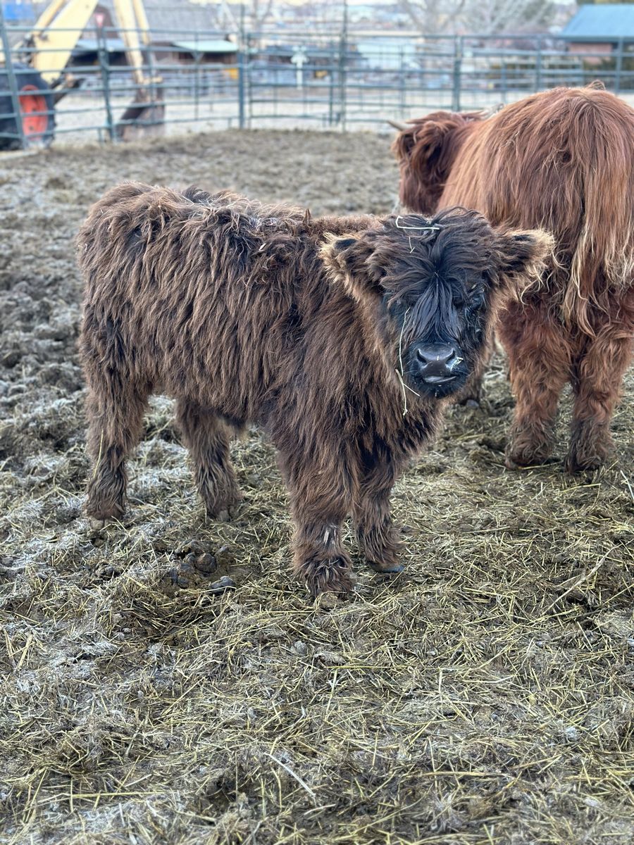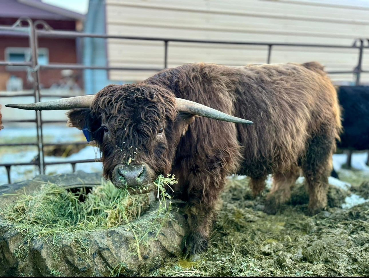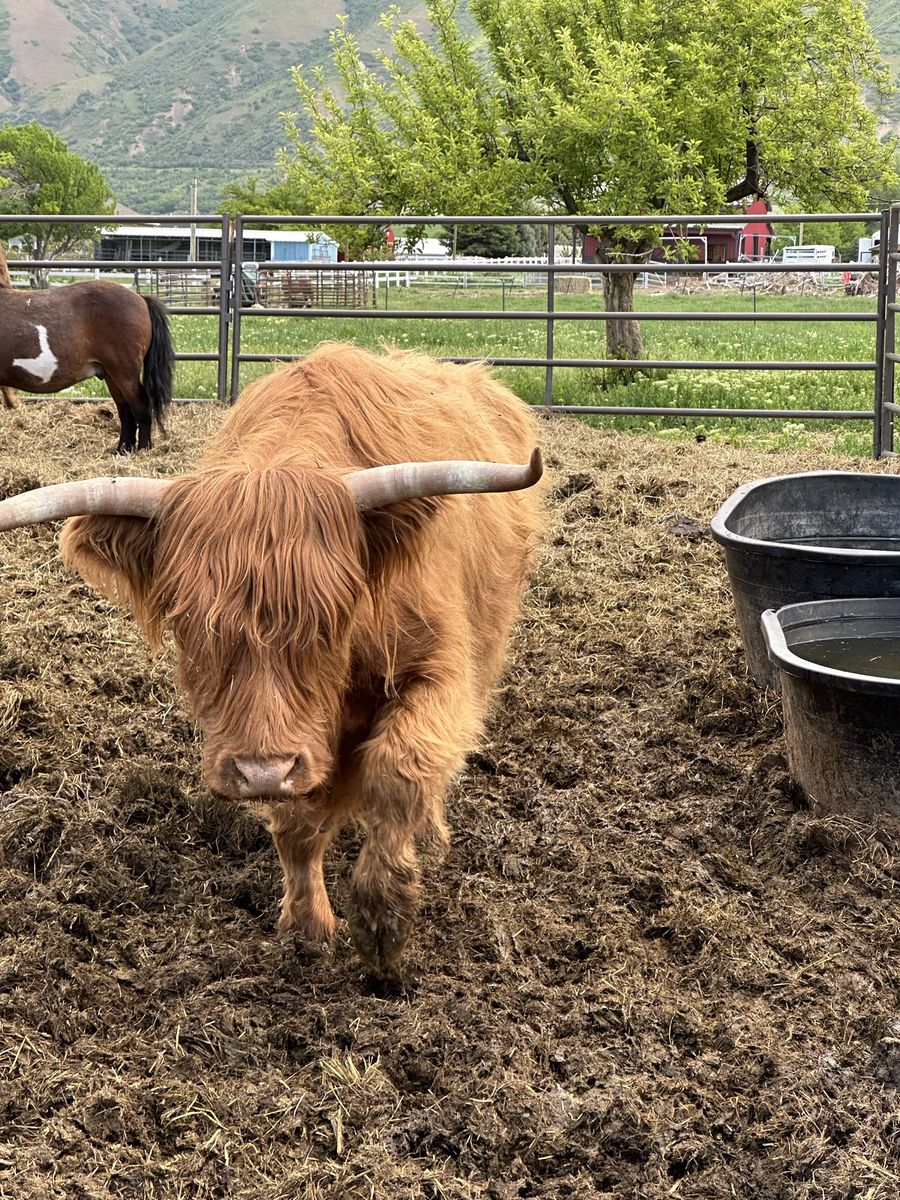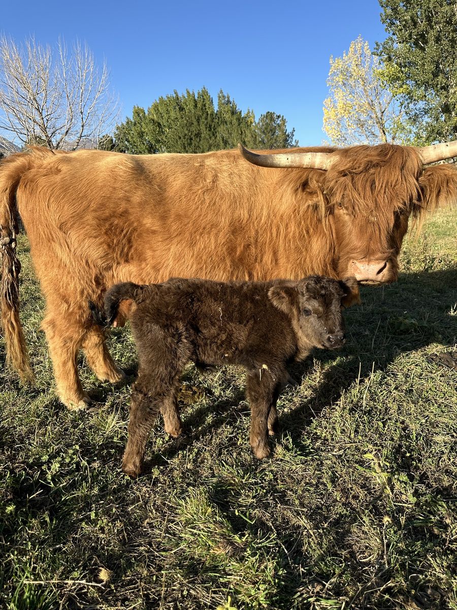 Nelly is the biggest sweetheart you’ll find. Loves to be brushed and absolutely loves treats. Will follow you anywhere if you have a grain bucket. Is bred to calve this fall with our 47” Dun Highland bull. She’s smaller midsize but not a mini. I’ll include pictures of our bull and her previous calf.