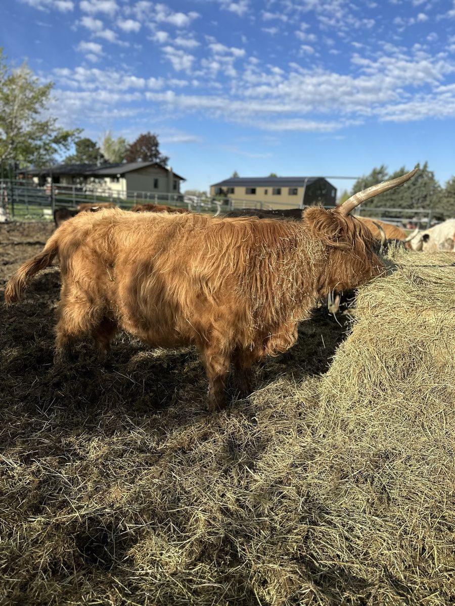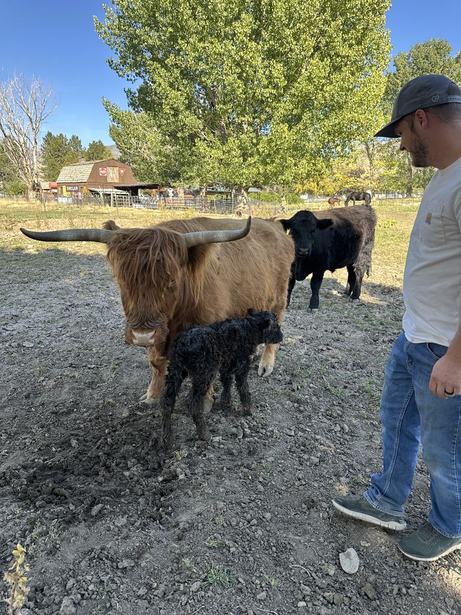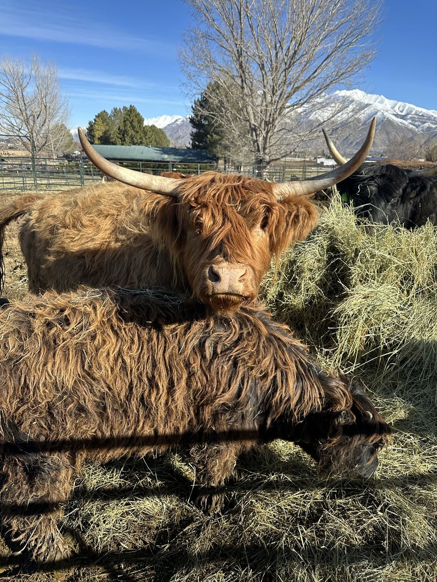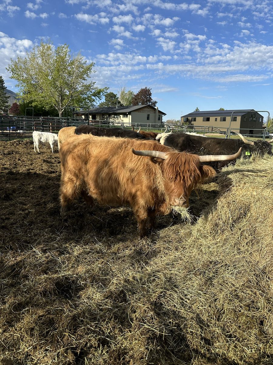Nelly is the biggest sweetheart you’ll find. Loves to be brushed and absolutely loves treats. Will follow you anywhere if you have a grain bucket. Is bred to calve this fall with our 47” Dun Highland bull. She’s smaller midsize but not a mini. I’ll include pictures of our bull and her previous calf.