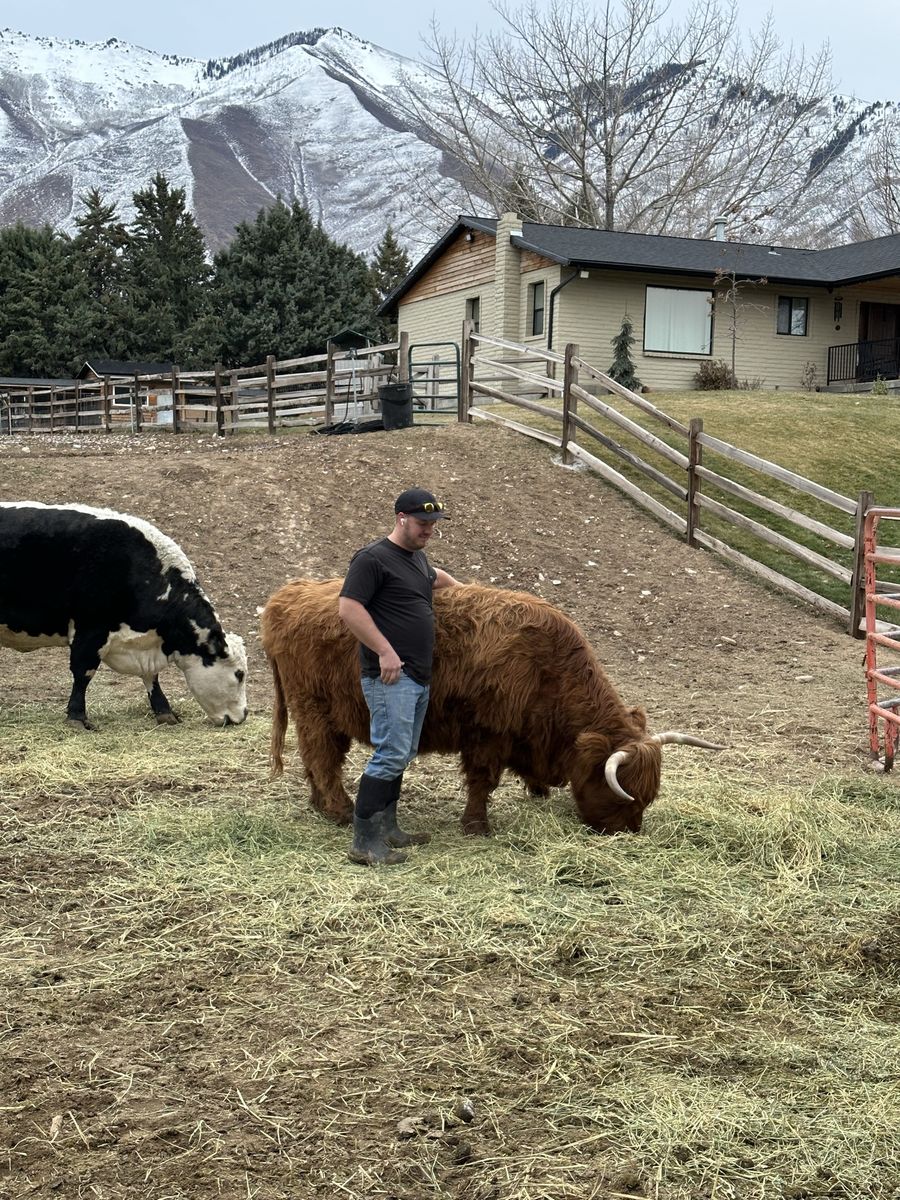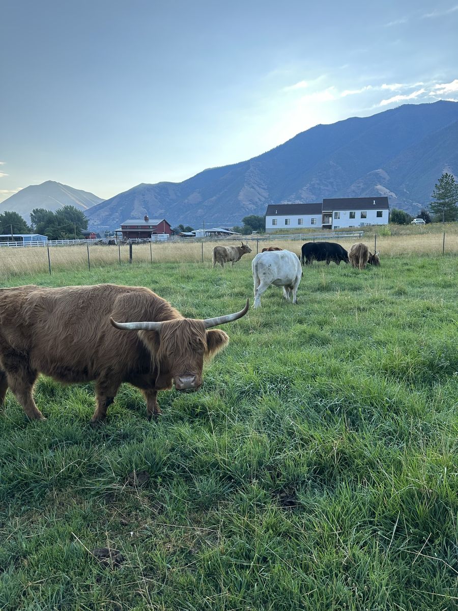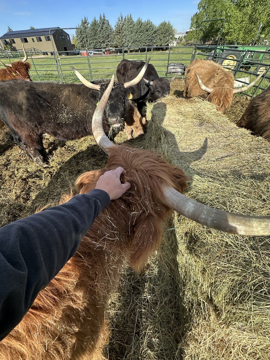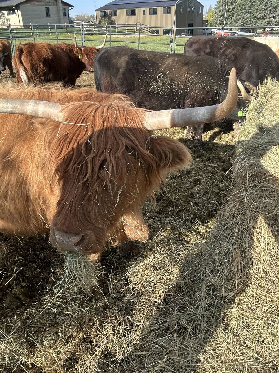 Nelly is the biggest sweetheart you’ll find. Loves to be brushed and absolutely loves treats. Will follow you anywhere if you have a grain bucket. Is bred to calve this fall with our 47” Dun Highland bull. She’s smaller midsize but not a mini. I’ll include pictures of our bull and her previous calf.
