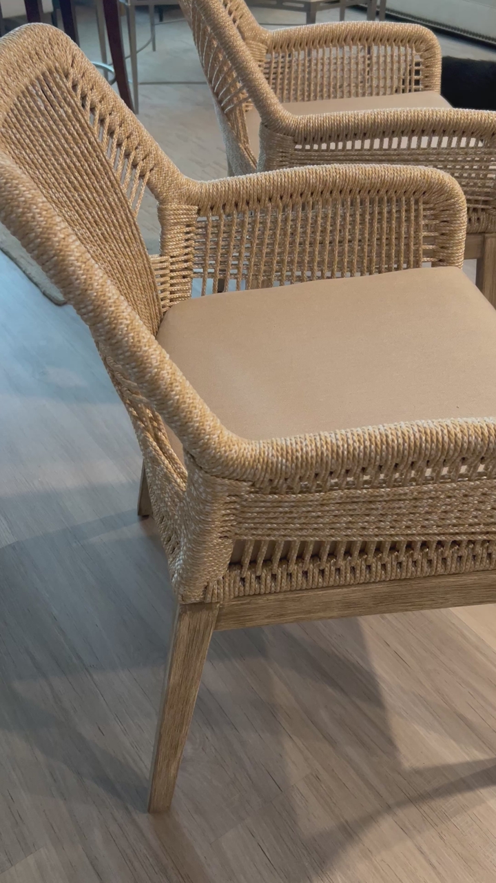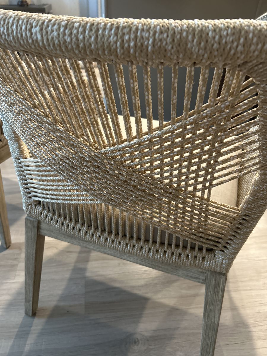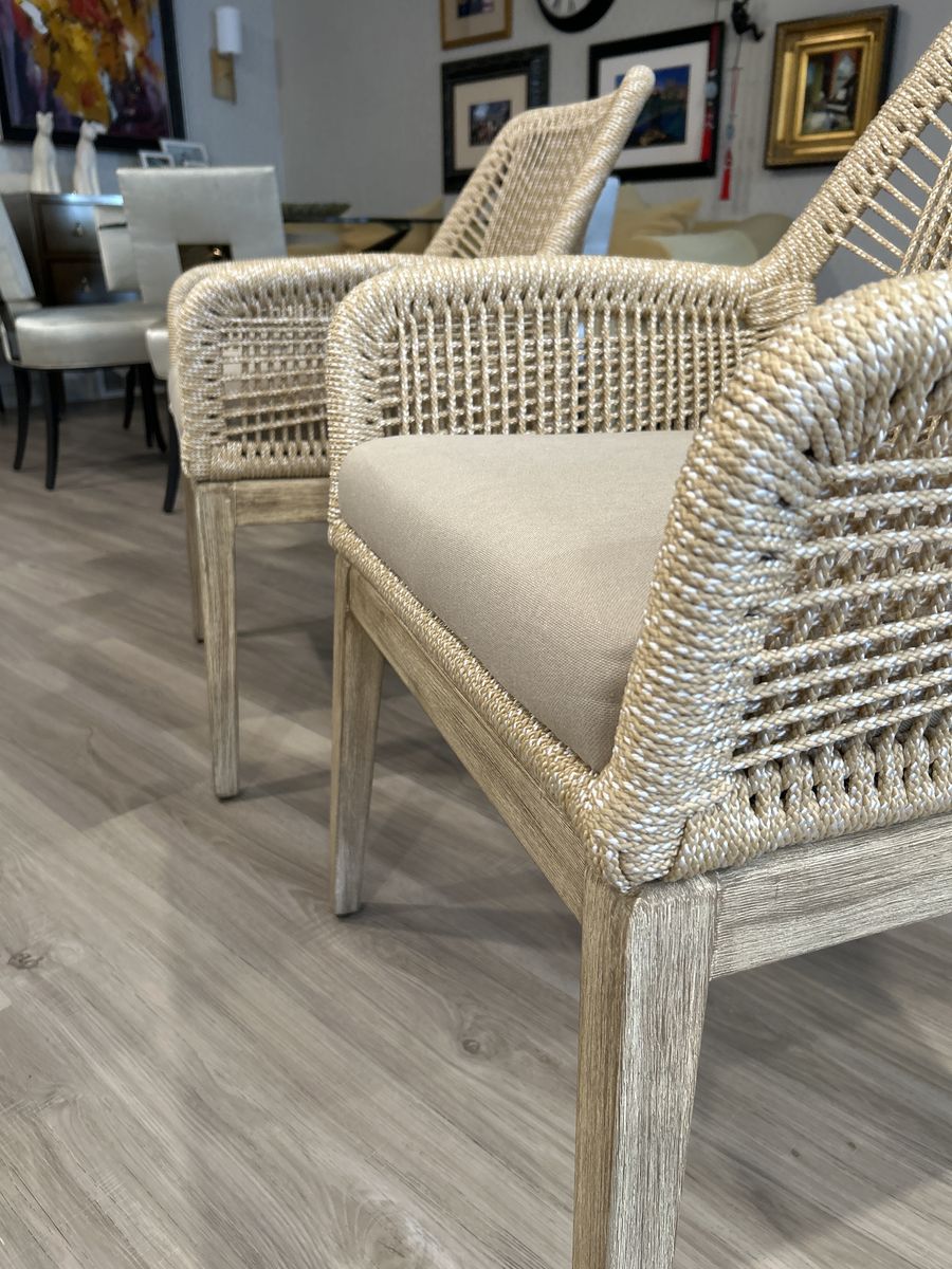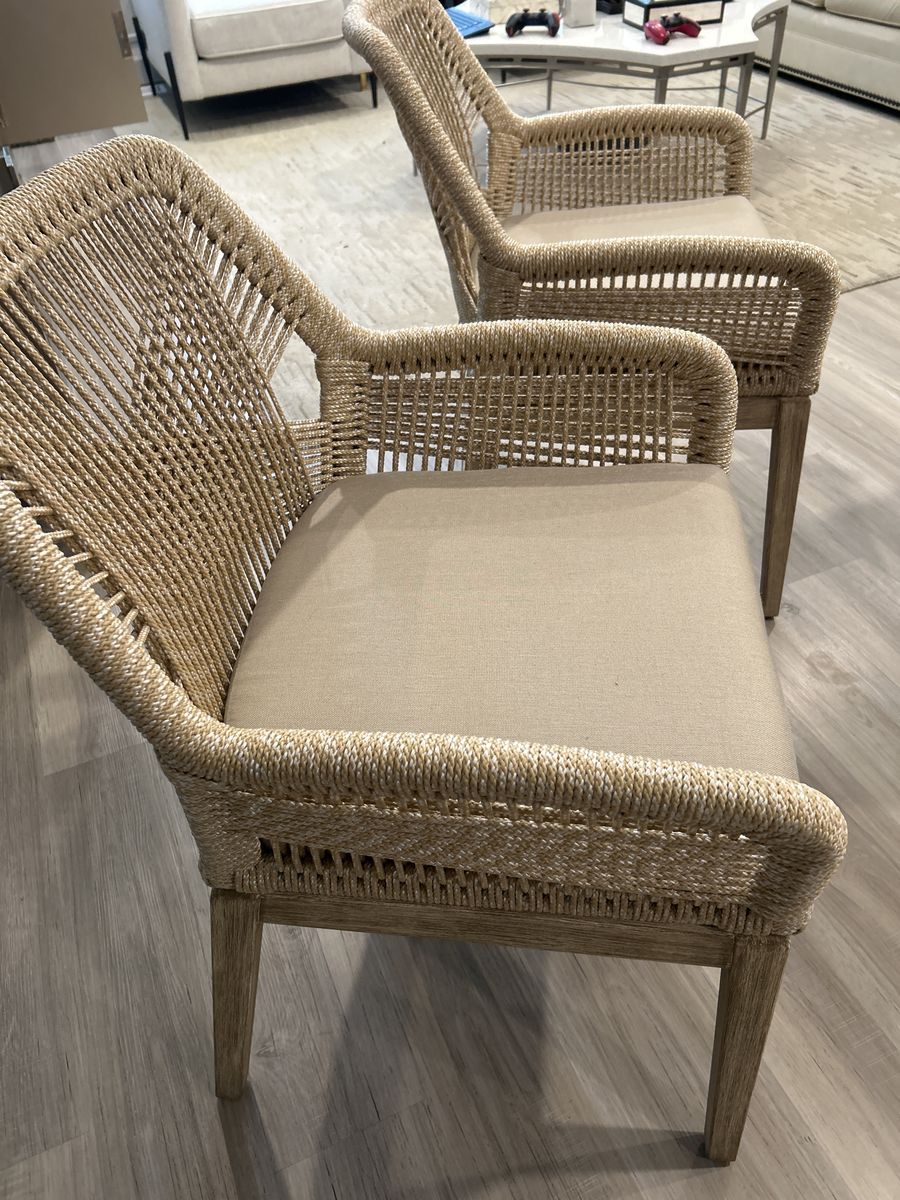 Two brand new arm dining chairs from a showroom , sand rope, tan and natural mahogany, dual aluminum frame, fixed cushion. Original price $1600