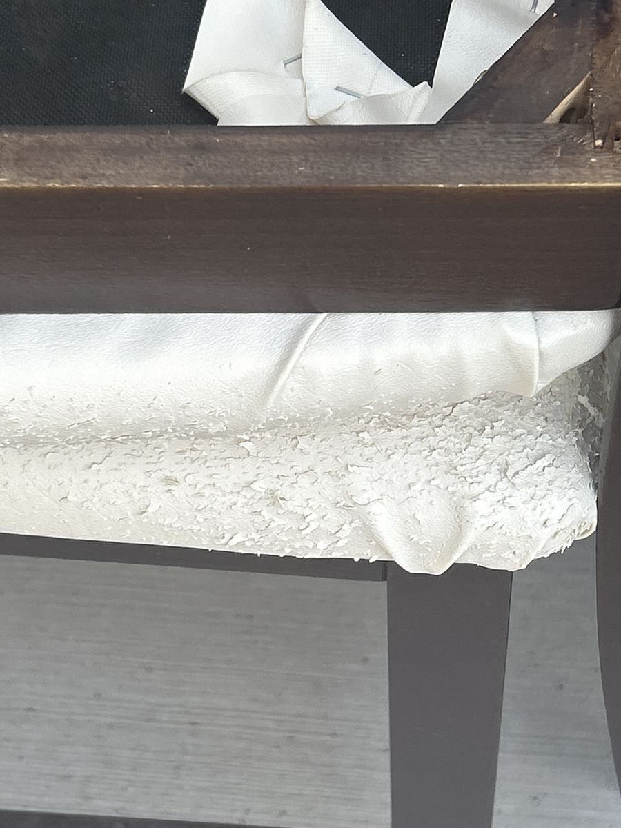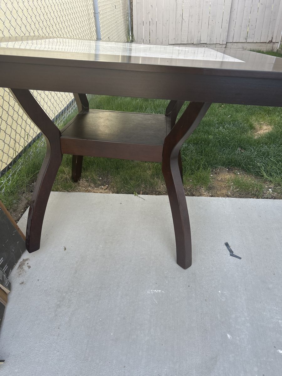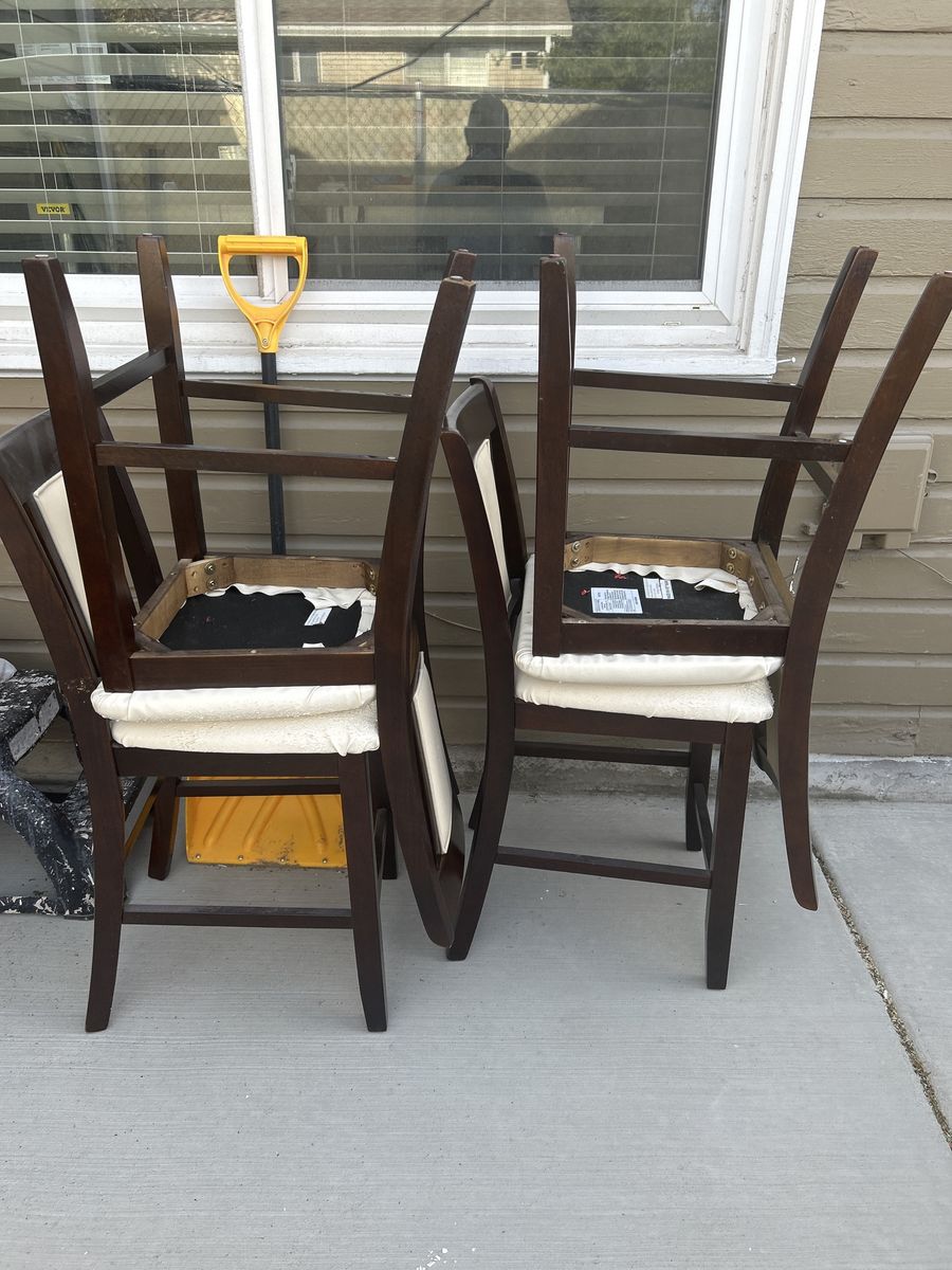 Counter height dining room table with 4 chairs. The chairs are sturdy, but a couple of them need to be fastened to the base. The seats are clawed up from the cat.