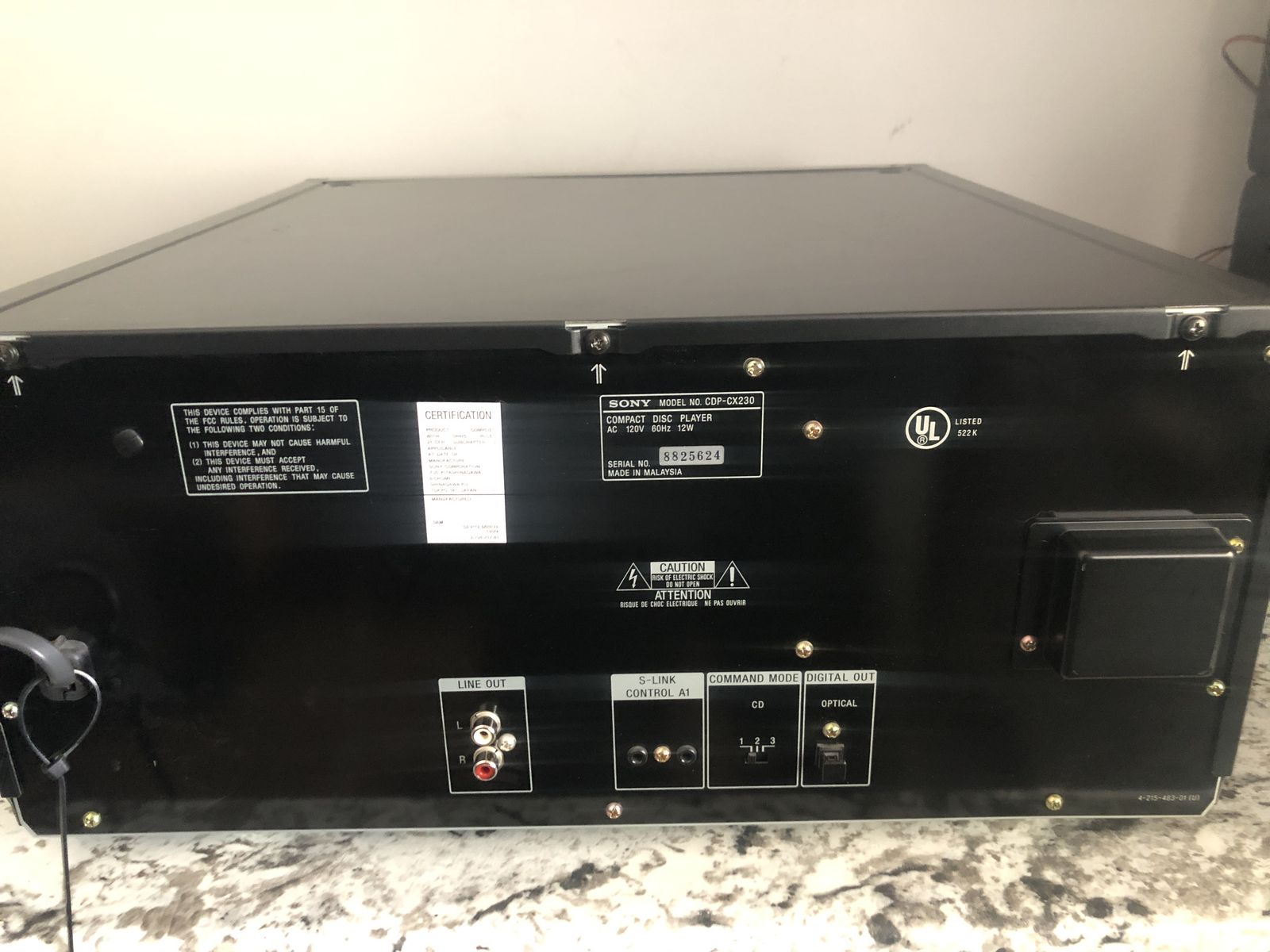 Sony CDP-CX230, 200 disc mega storage cd player. It's in very good shape, sounds great and in working order (see video) . It has RCA jacks and an optical digital out to connect an external DAC. Gears were recently lubed and the belts are good. No remote. Dimensions: 18"x17"x7.5"
