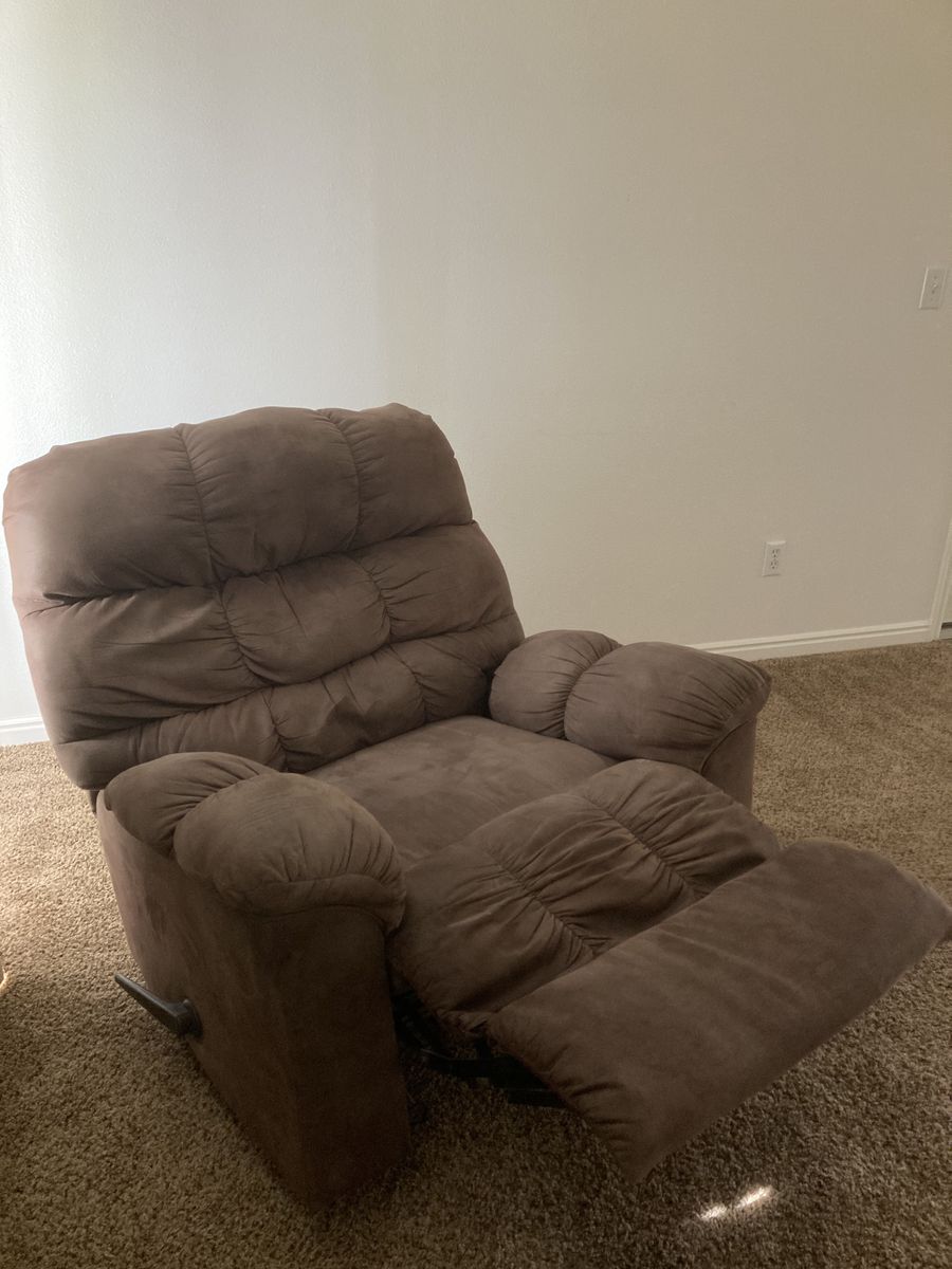 Brown microfiber rocker recliner with various positions. In good shape and everything works. Just don't need this anymore and moving. Non-smoking home. Cash only please. Bring someone to help lift it and no deliveries.