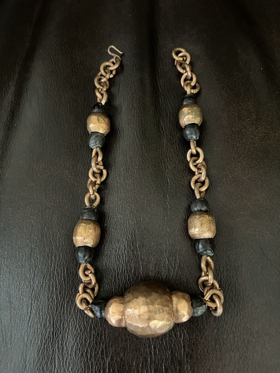 VenmoThis is from the 1930's. It is a heavier necklace because of all the copper. The copper has been hand hammered. It measures 17 inches long. It's a really cool necklace. Must see! Selling for a parent. Price is firm.