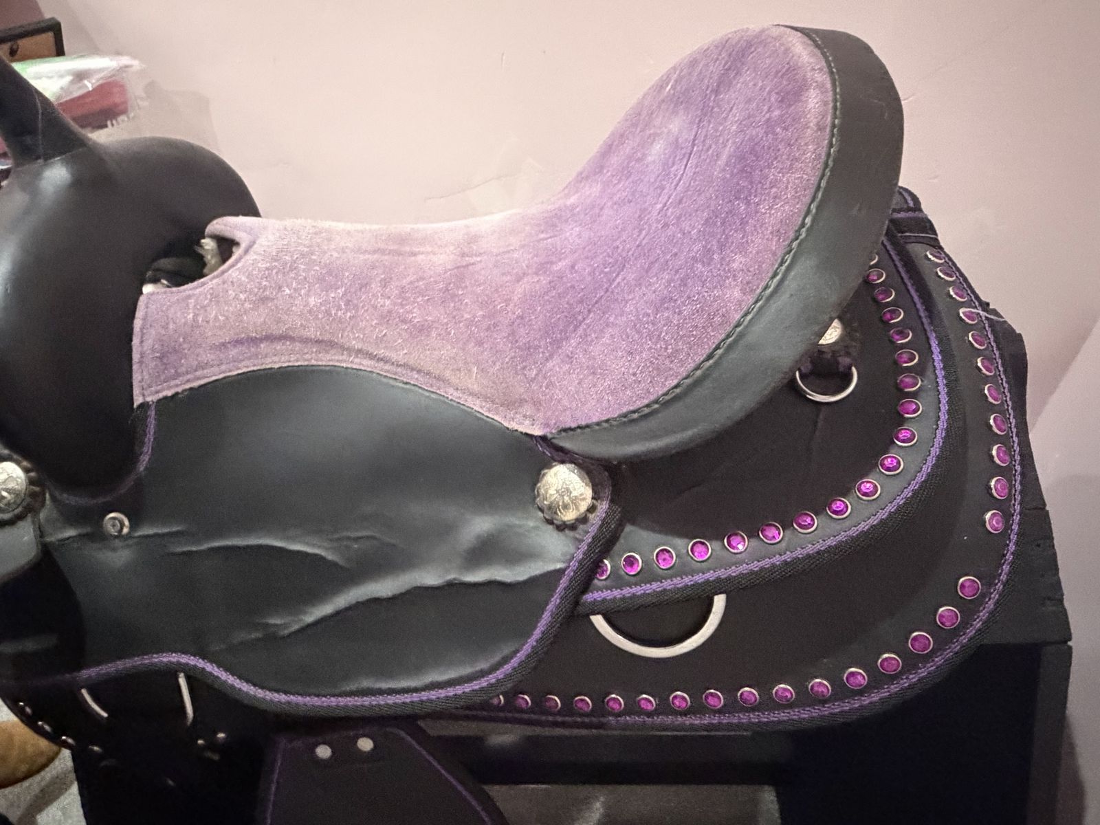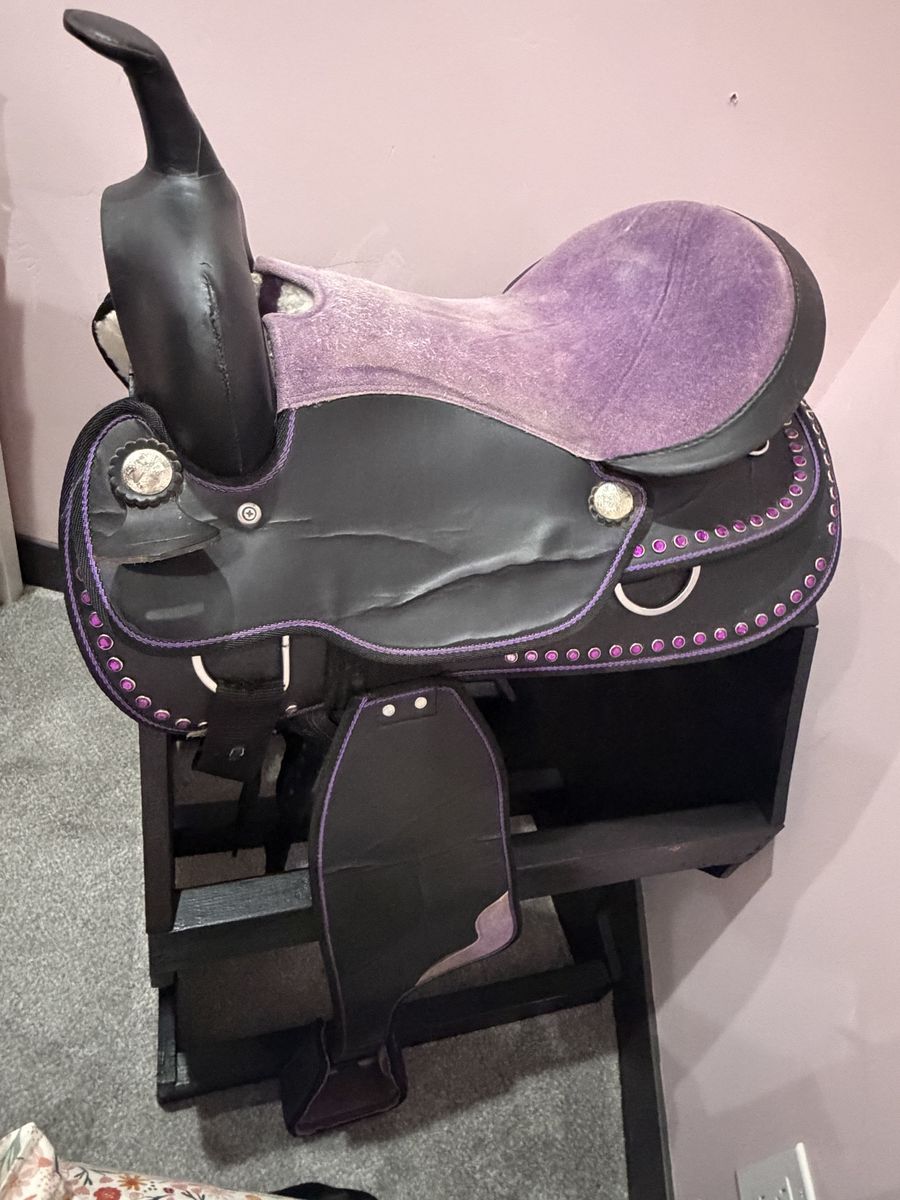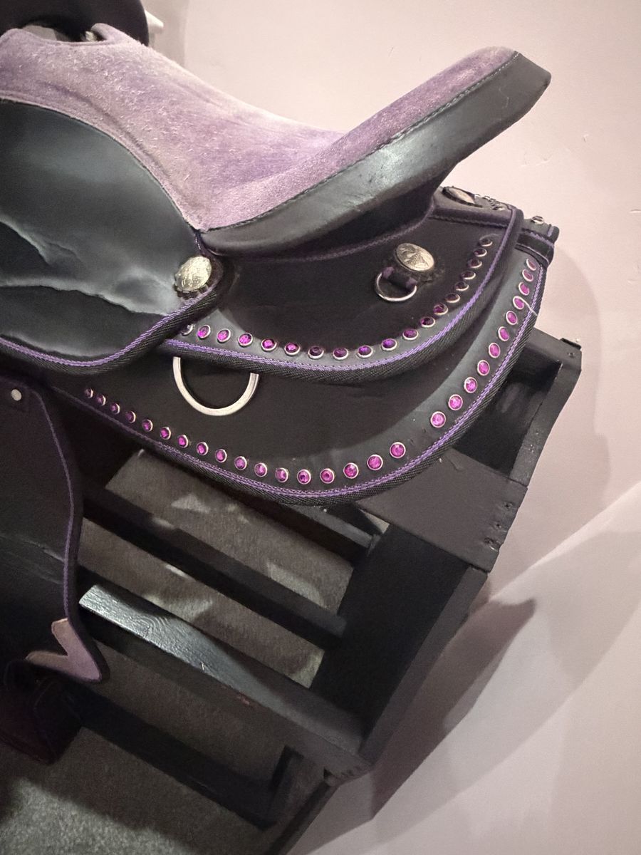ApplePayDecorative purple saddle with rhinestones and black wood saddle stand. Both on good condition