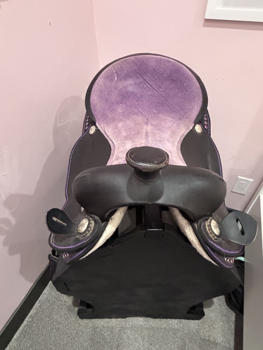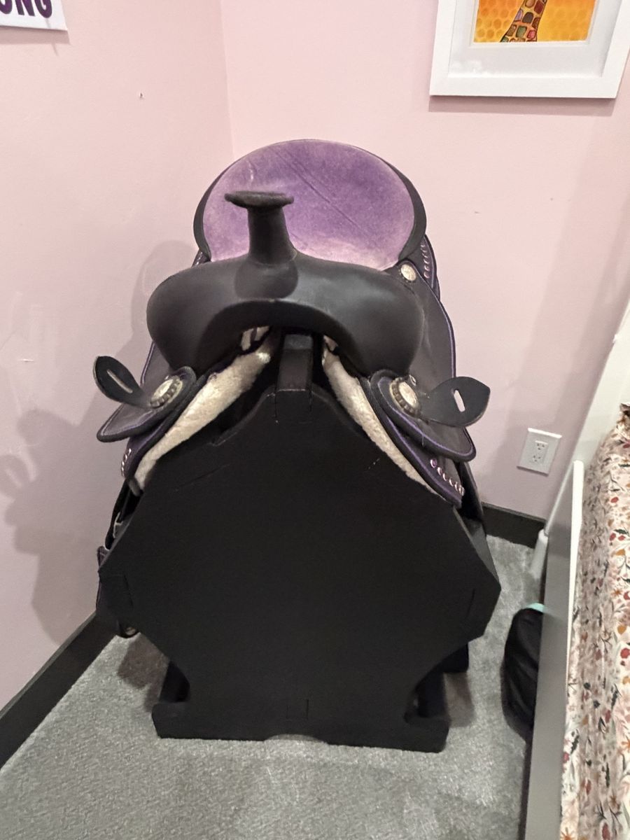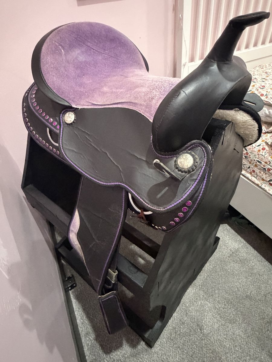 ApplePayDecorative purple saddle with rhinestones and black wood saddle stand. Both on good condition