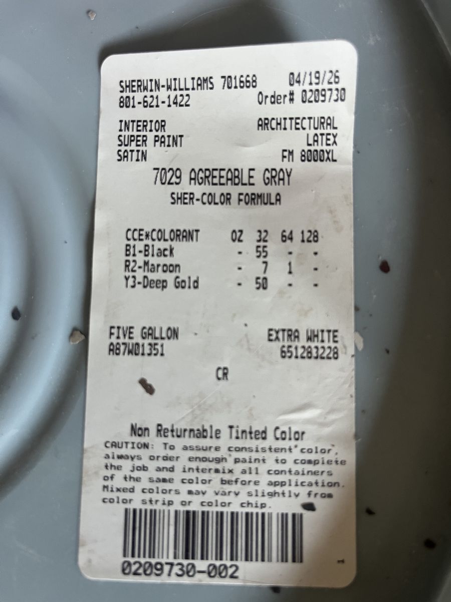 PayPalPaint color is hi hide white in SATIN finish. Purchased April 20th. Can’t use it, can’t take it back. Paid $48.00 gal for it, over $250.00 for this fiver. You can have it for $200.00