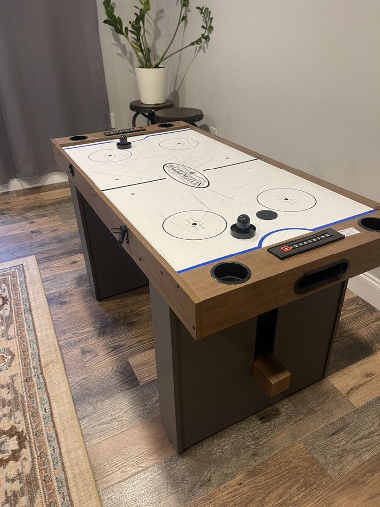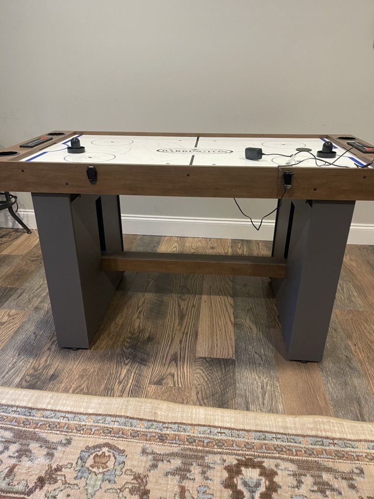 VenmoVersatile multi-game table. Has foosball, air hockey, and ping pong! Comes with all accessories shown, like ping pong net, paddle, ball, foosball ball, air hockey pucks, paddles. Air hockey table works perfect! Great for game room fun! 54” long.