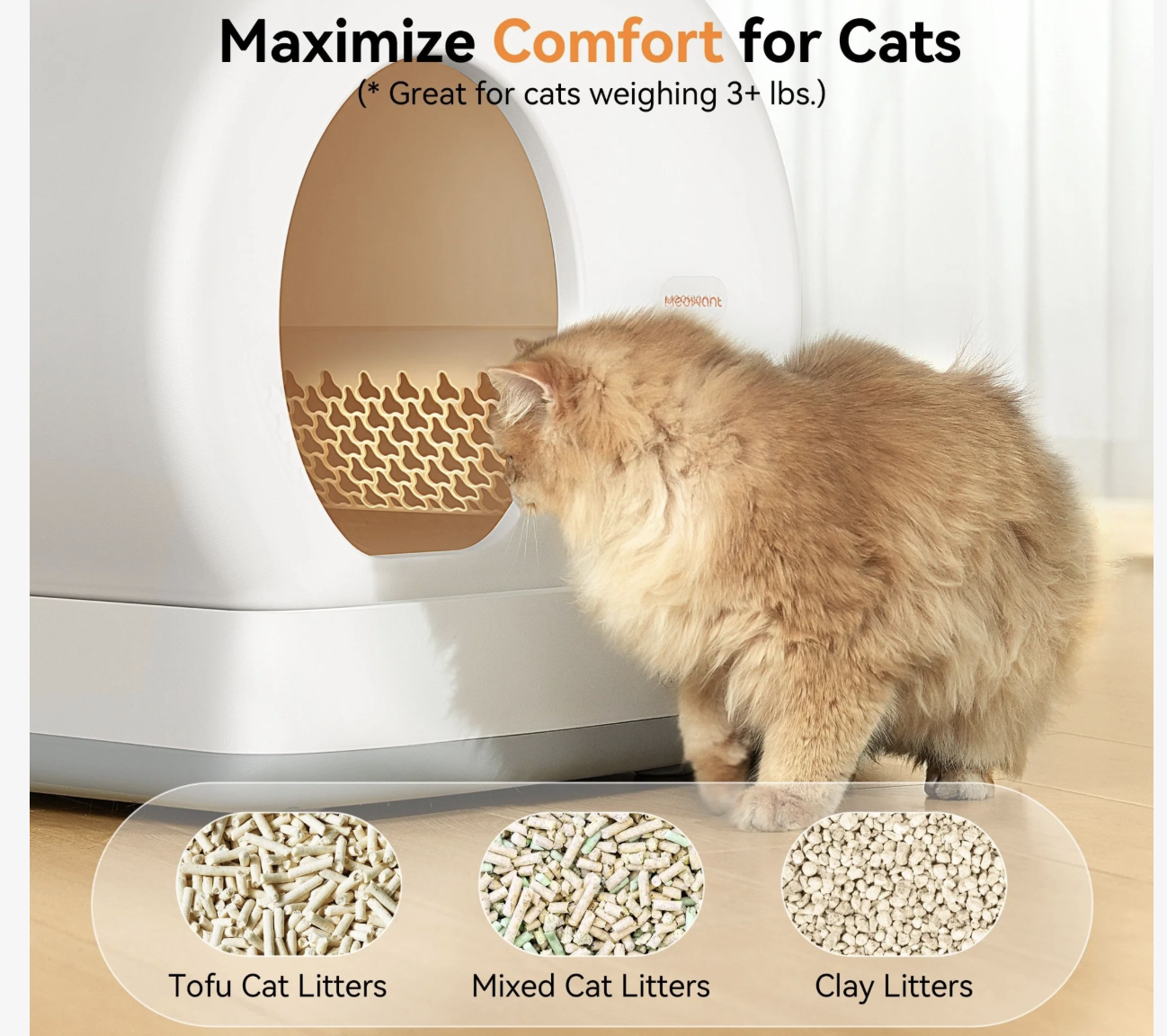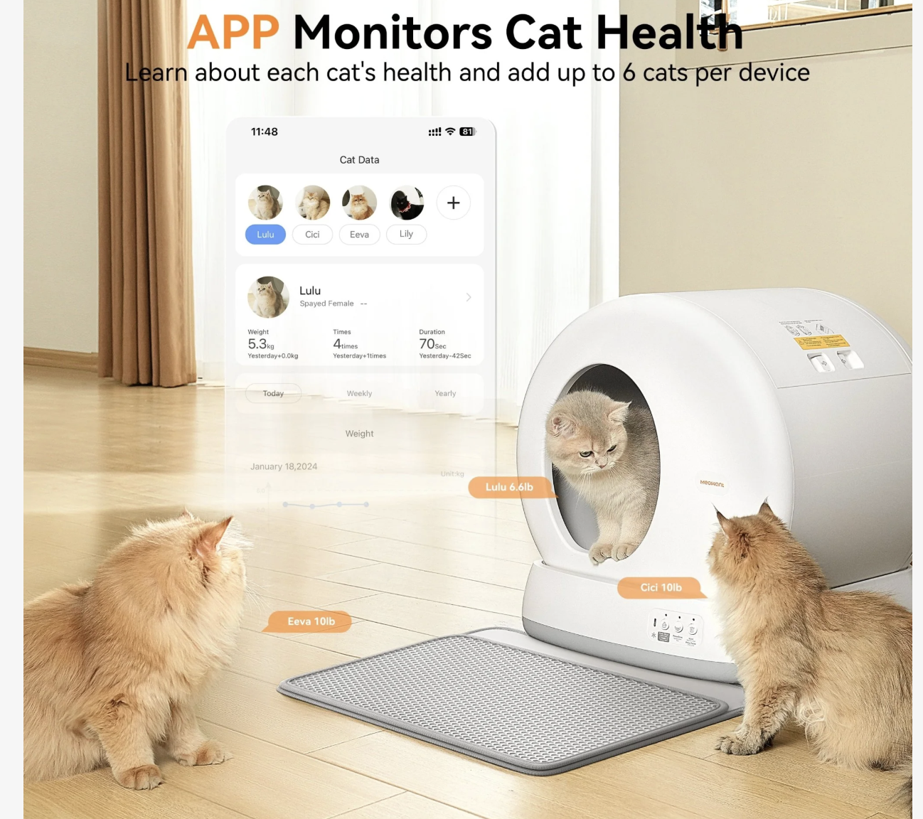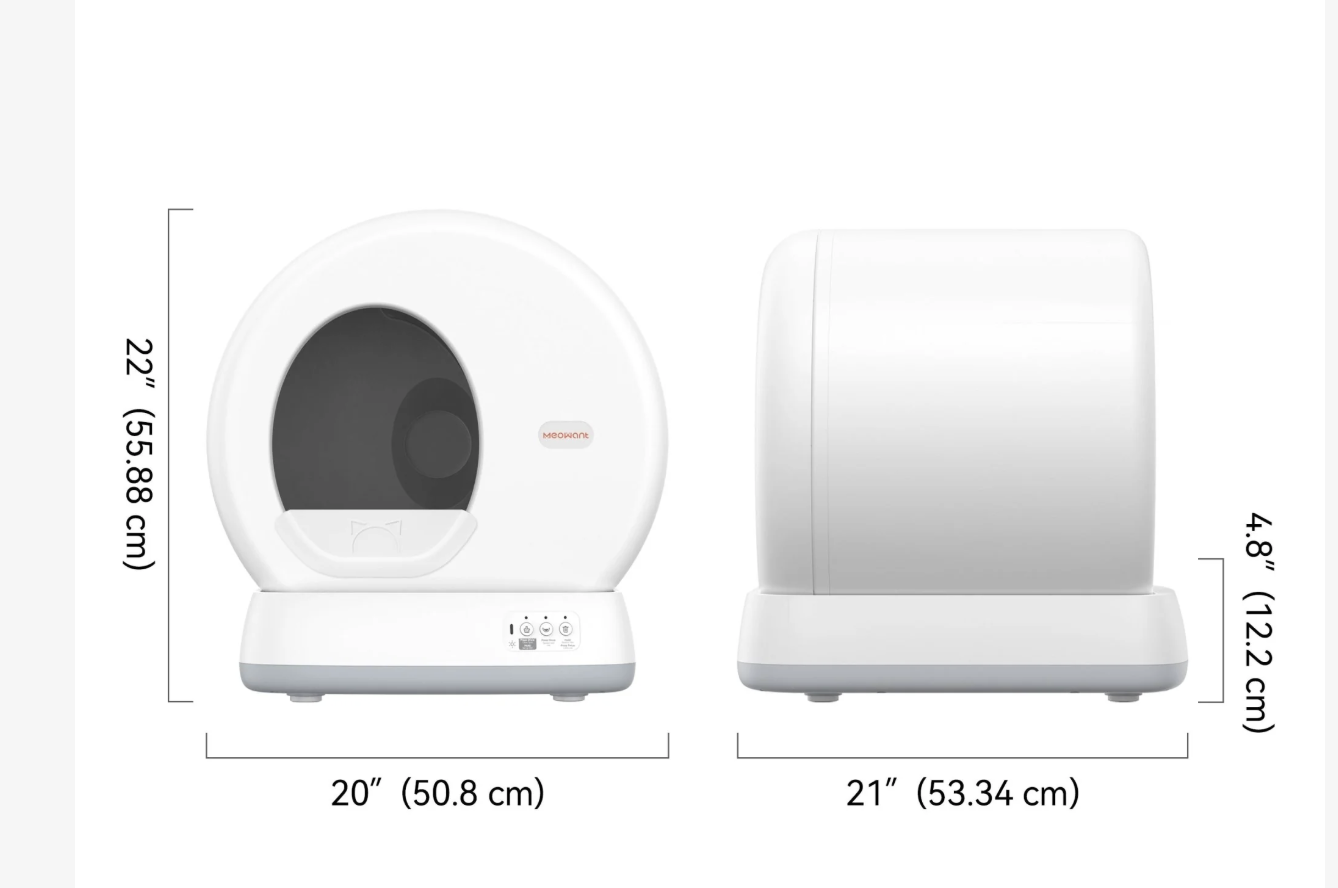 The Meowant Smart WiFi Enabled Automatic Self-Cleaning Cat Litter Box offers a spacious and comfortable environment for your feline friend. With a generous 75L toilet space and an open-design large entrance, your kitty can move freely and comfortably. Designed for furbabies weighing between 3.3 and 22 pounds, this litter box ensures maximum comfort and ease of use. Its ultra-low entrance is especially beneficial for short-legged, overweight, and senior furbabies, allowing them to enter and exit effortlessly. Safety is a top priority, and this automatic litter box is equipped with a unique integrated anti-pinch structure that eliminates the risk of your purring pal getting caught between the litter chamber and the rotating drum. With nine high-precision sensors, the unit continuously monitors weight changes, automatically stops movement when necessary, and detects any abnormalities to ensure your four-legged family member’s safety. For accurate weight readings, it is recommended not to place a mat under the litter box.