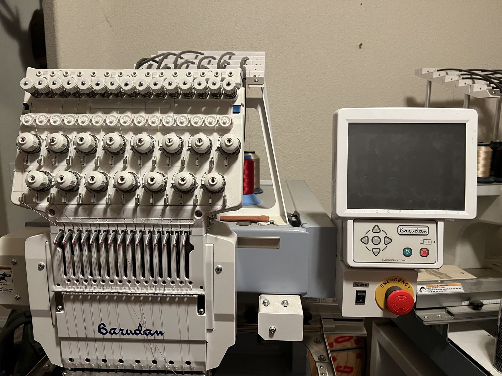 2 Barudan embroidery machines ready to go. Both are in great shape. Comes with numerous hoops and about 60 different colors of thread, owners manual. Bought for a side business but don't have the time to get orders filled. $15,000 for both machines obo