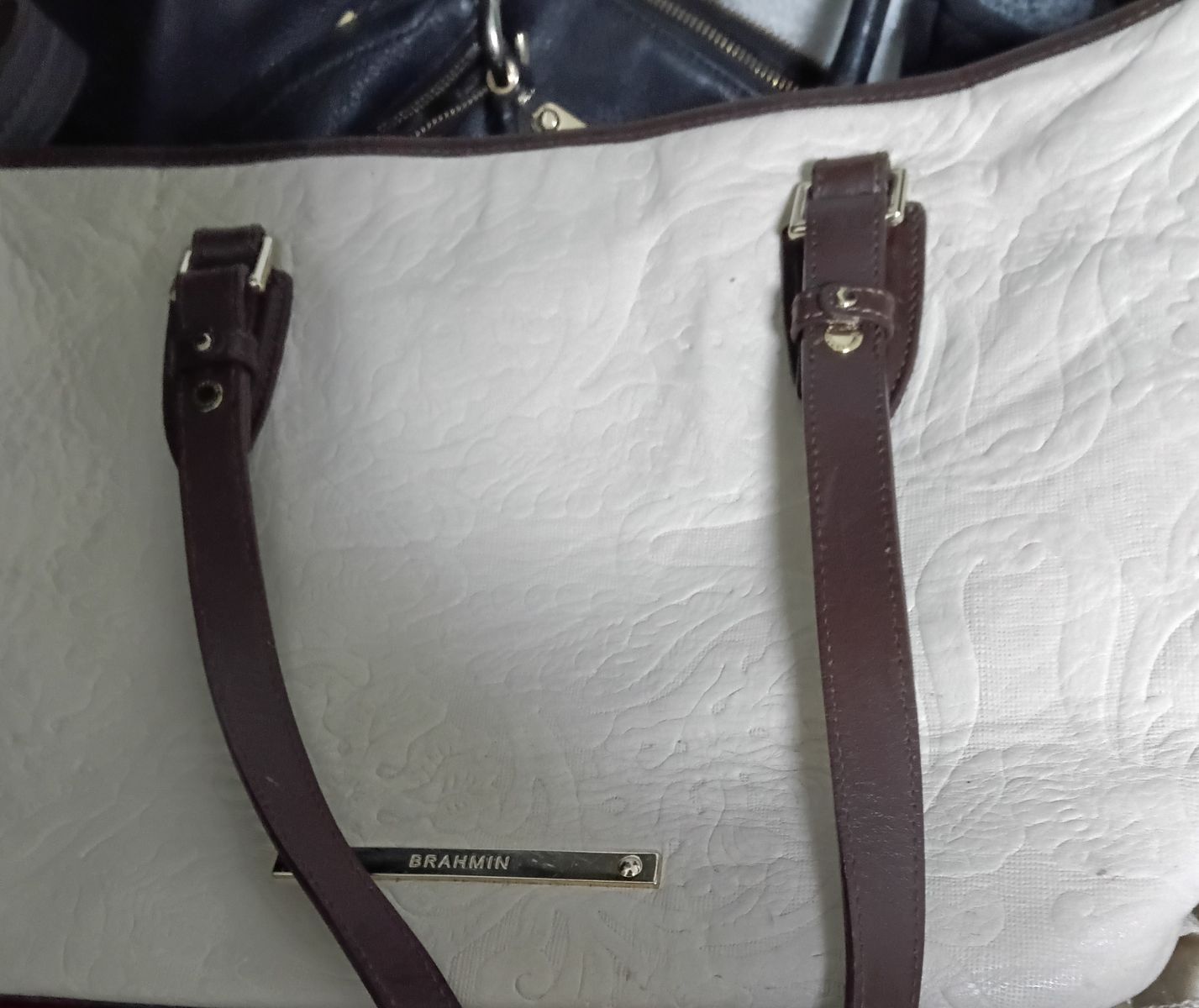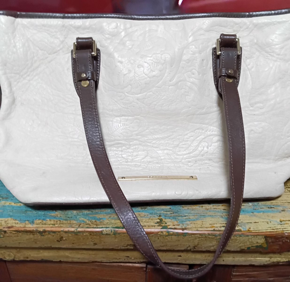 Pre-owned White flexible Paisley floral leather with brown leather trim . Gold hardware and slide pocket on the back. Few ink dots inside