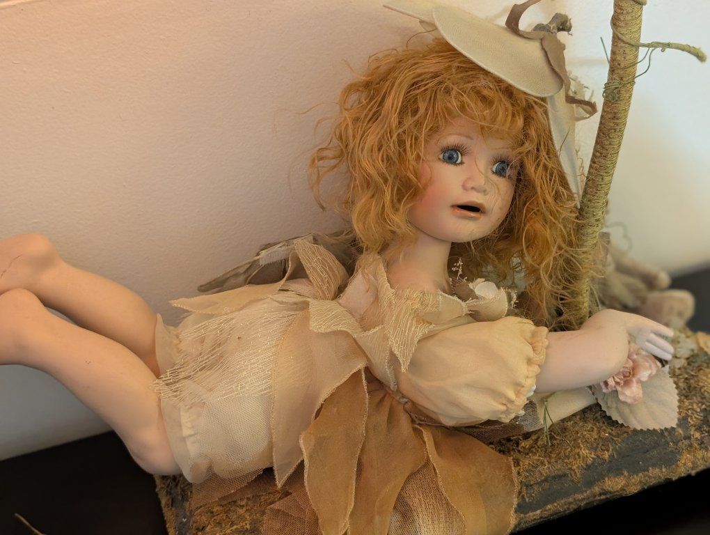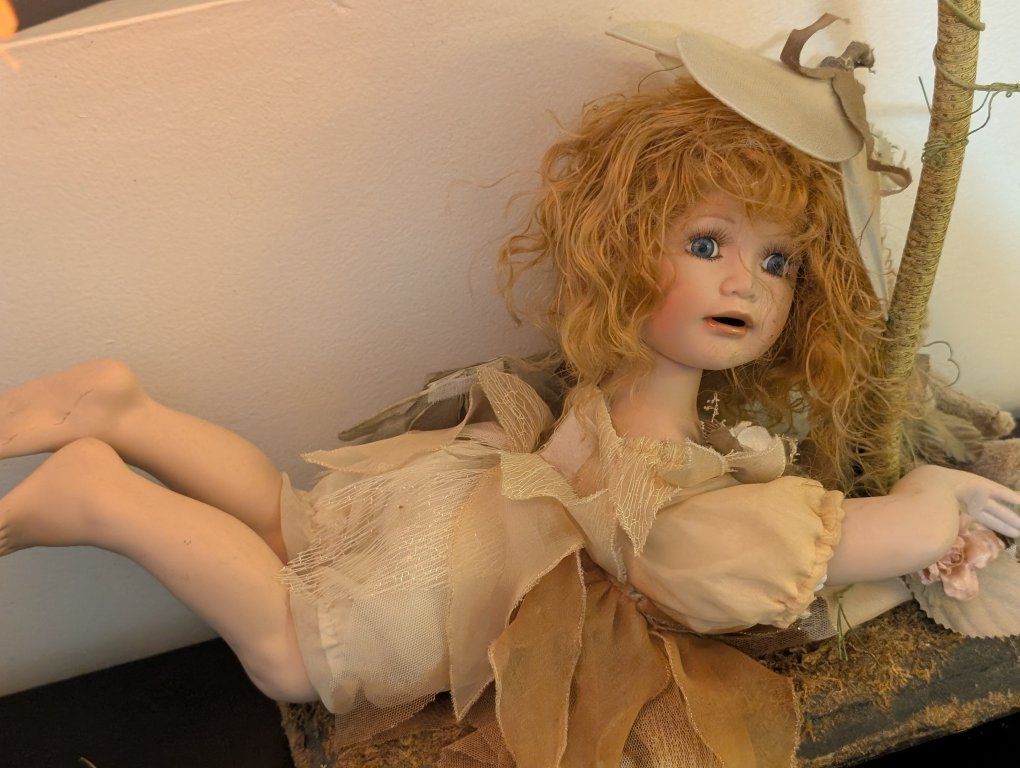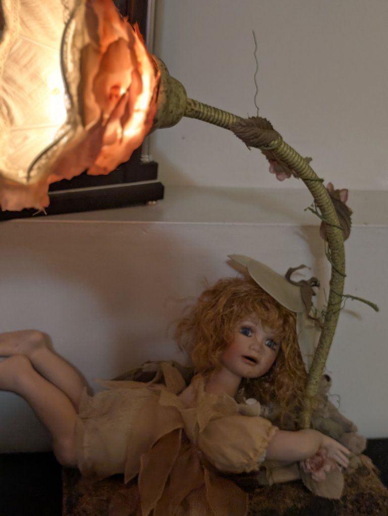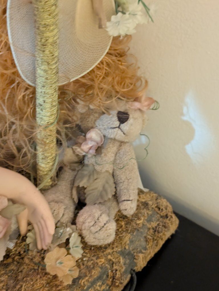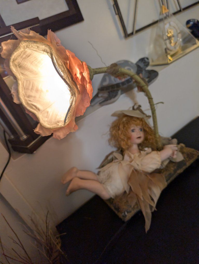 Duck House Heirloom Porcelain Fairy Doll Hugging Flower Lamp Red Hair. vintage in excellent working condition located in Roy venmo or cash fcfs