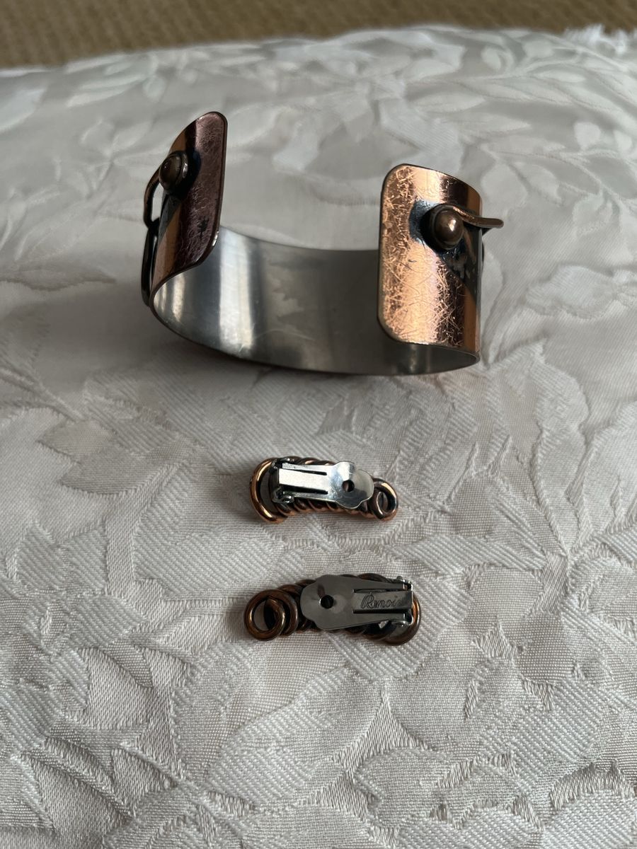 VenmoVery cool and unusual set! Marked Renoir. Bracelet measures 1 1/8 inches across. Earrings are clip on and measure 1 3/8 inches. Thinking this is copper. Sold as a set. Must See! Price is firm.