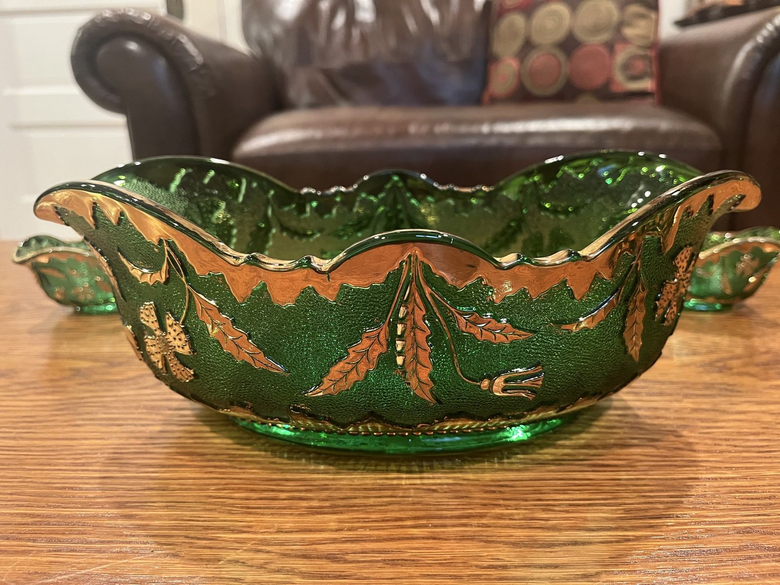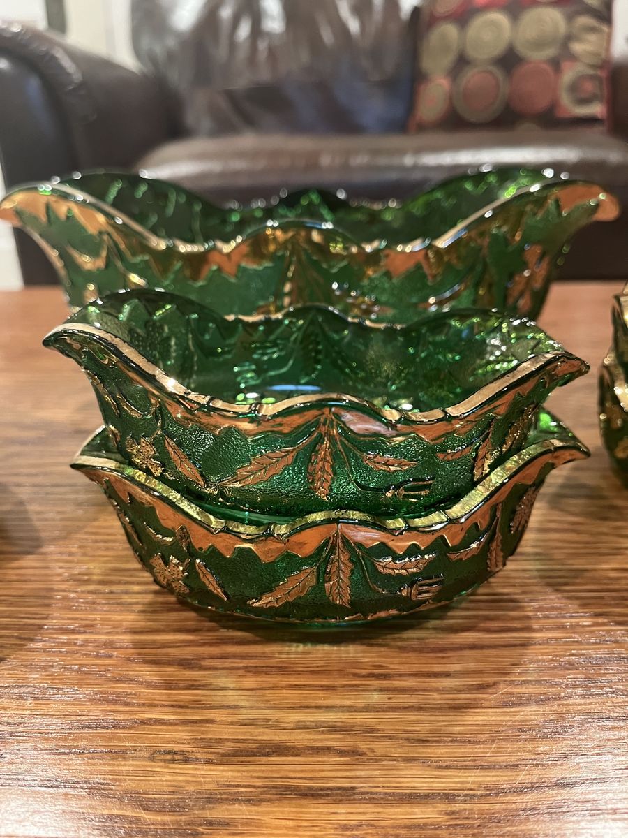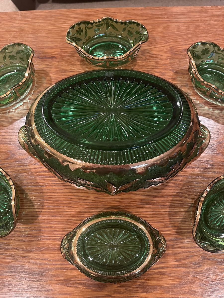 VenmoThis is a stunning set in excellent condition. This glass is Early American Pattern Glass, EAPG. Made by US Glass Company. Which started making glass in 1899. The pattern is called Delaware which was part of their State Series. This has the gold gilt decorated glass, which really adds beauty to the raised floral and leaf pattern. The large oval bowl measures 4 inches tall x 11 3/4 inches long x 7 1/4 inches across. The small berry bowls measure 1 3/4 inches tall x 5 1/2 inches long x 3 1/2 inches across. The green color is quite vibrant. There is a tiny bit of wear of the gold on the large bowl. Otherwise this looks like it was never used. Sold ony as a set. This is a must see item! Price is firm.