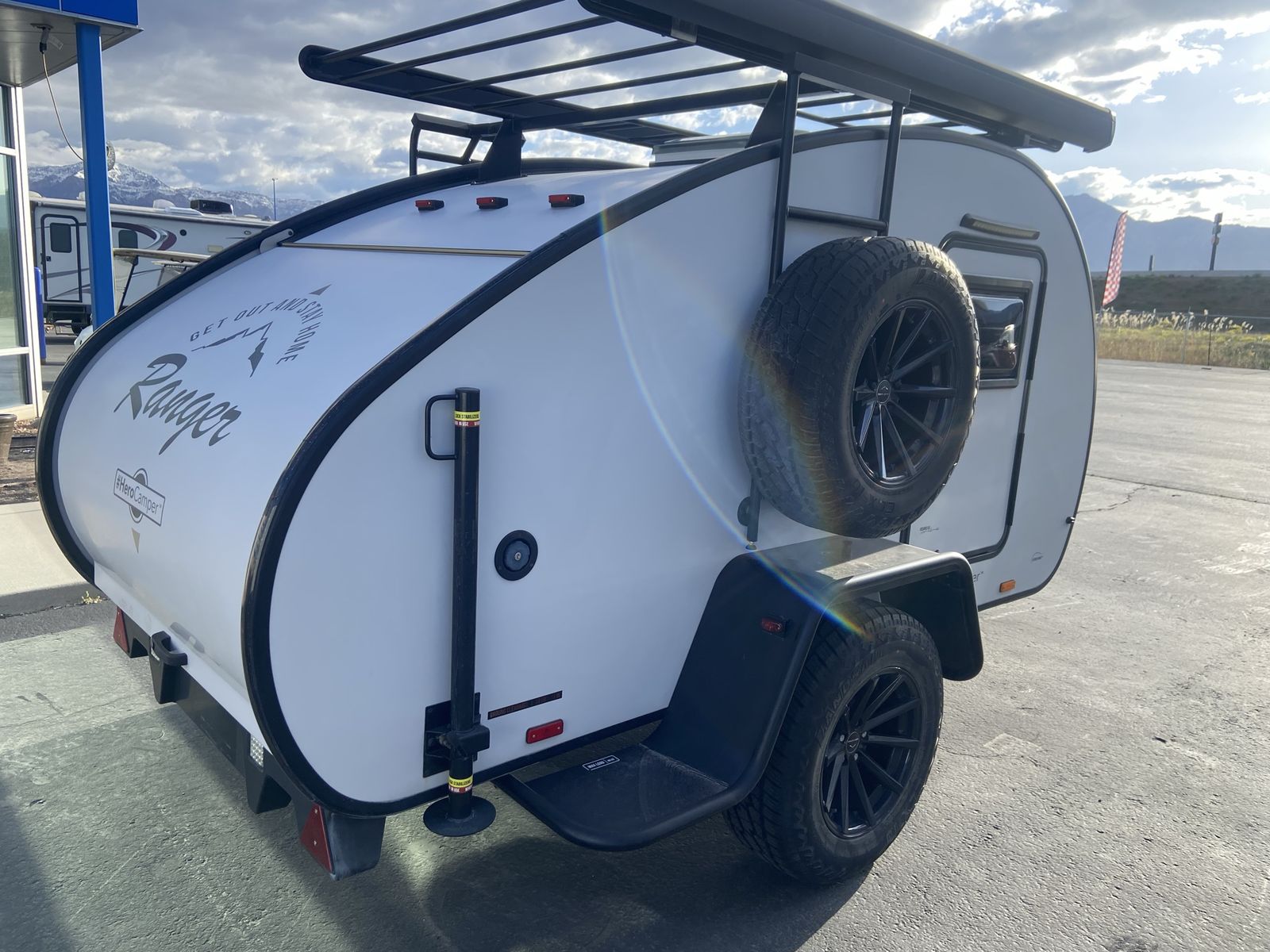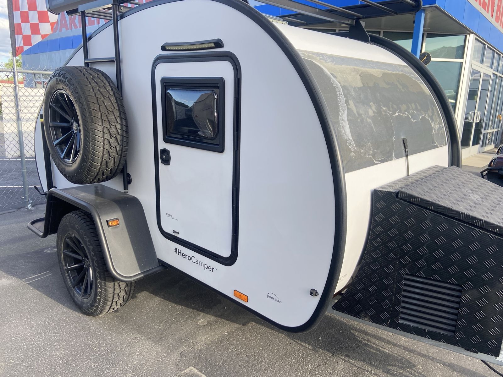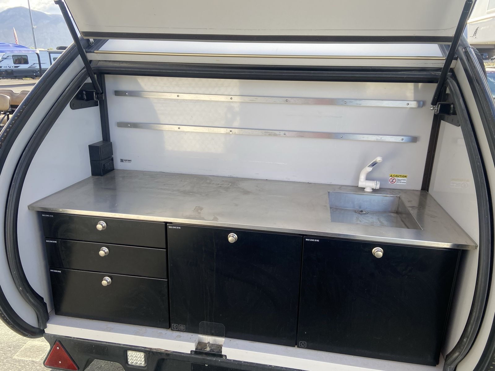 Awesome tier drop trailer Australia design. Sleep 2. Outside kitchen area. Ladder and roof rack. Storage box up front. Small suv towable. 7829 Darin BidO Solar controller and solar. Message Stuart