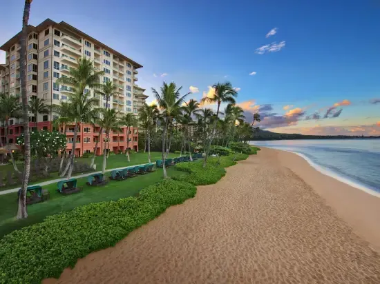 Kaanapali Beach with beach boardwalk to Whaler's Village.