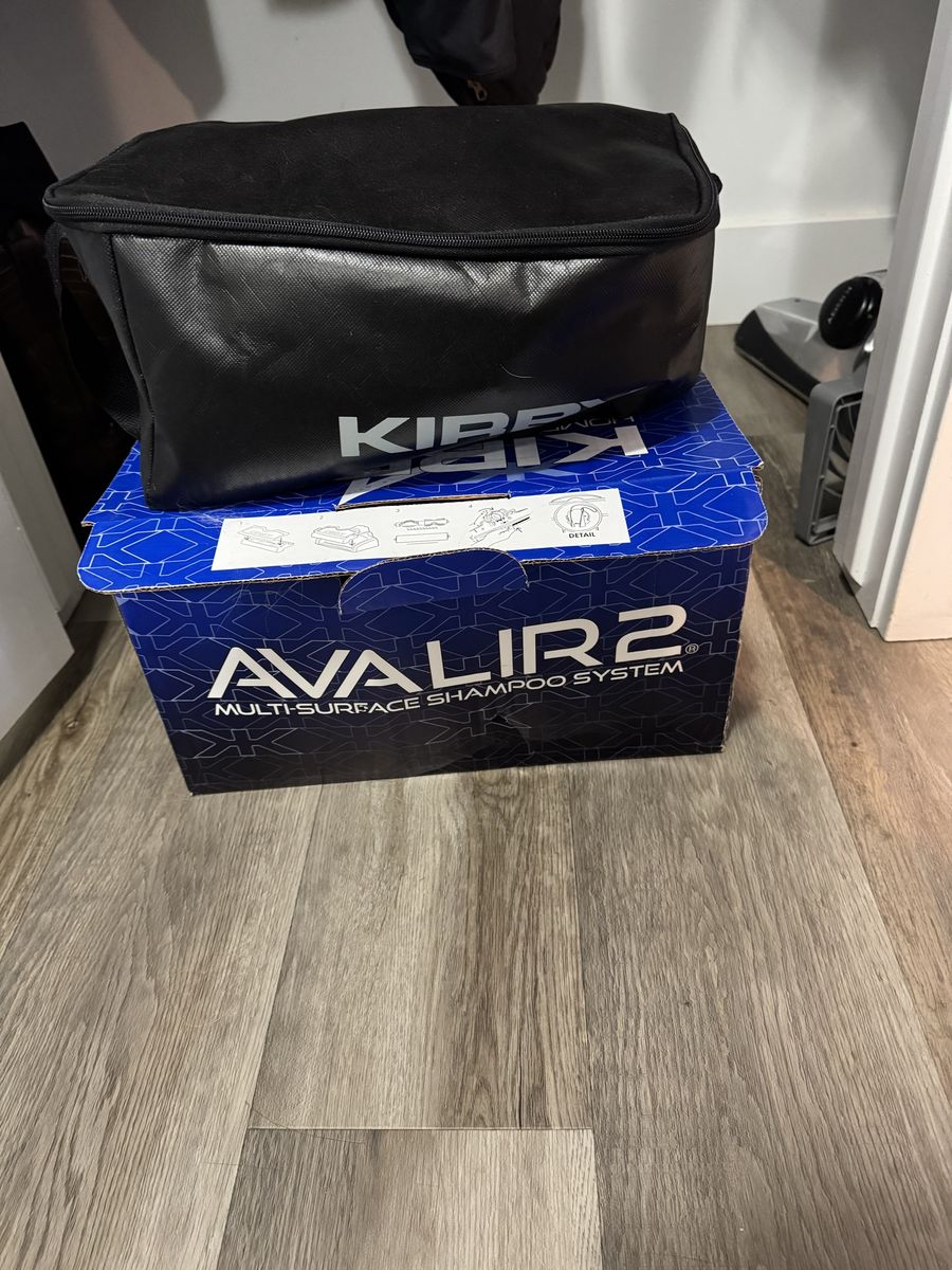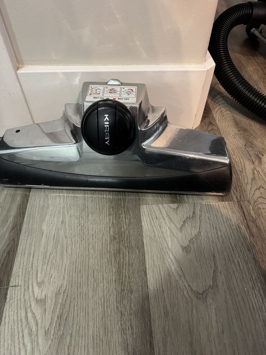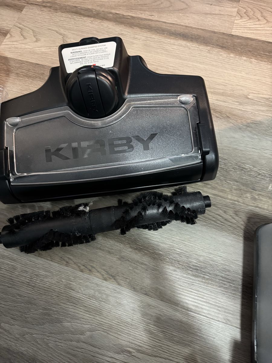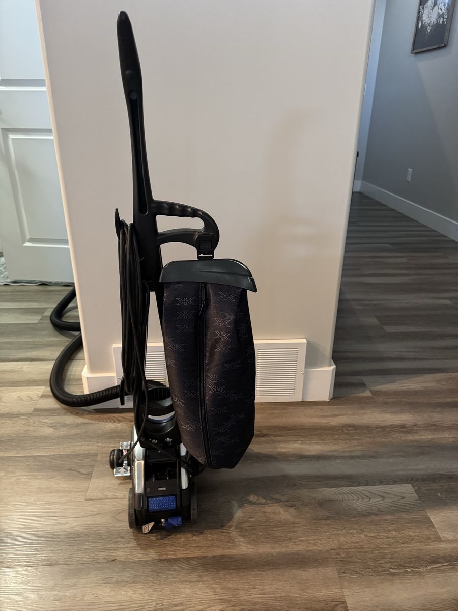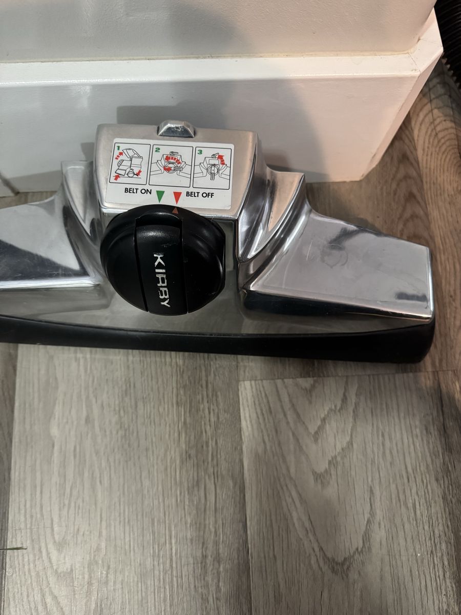 ZellePowerful Kirby Avalir 2 upright vacuum has a polished aluminum body with blue accents. This versatile cleaning system includes the main upright unit, a long flexible black hose, and the carpet shampooer/power nozzle head. It is a high-end corded model known for durability and deep cleaning capabilities. Has a small hole in hose attachemet (duct taped and works great) bought about a year ago. Price OBO