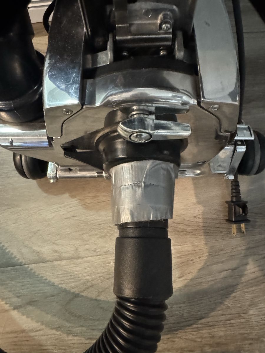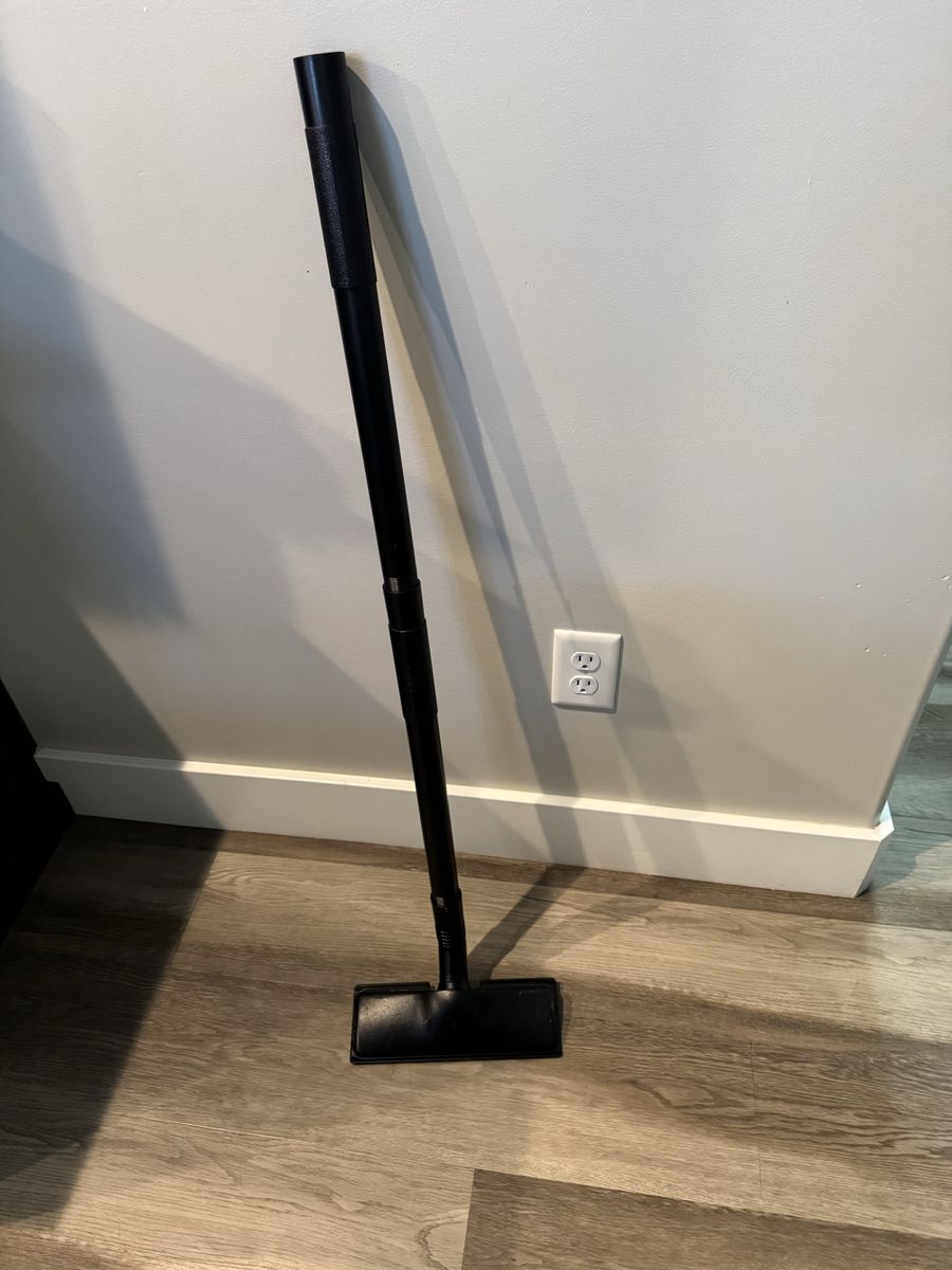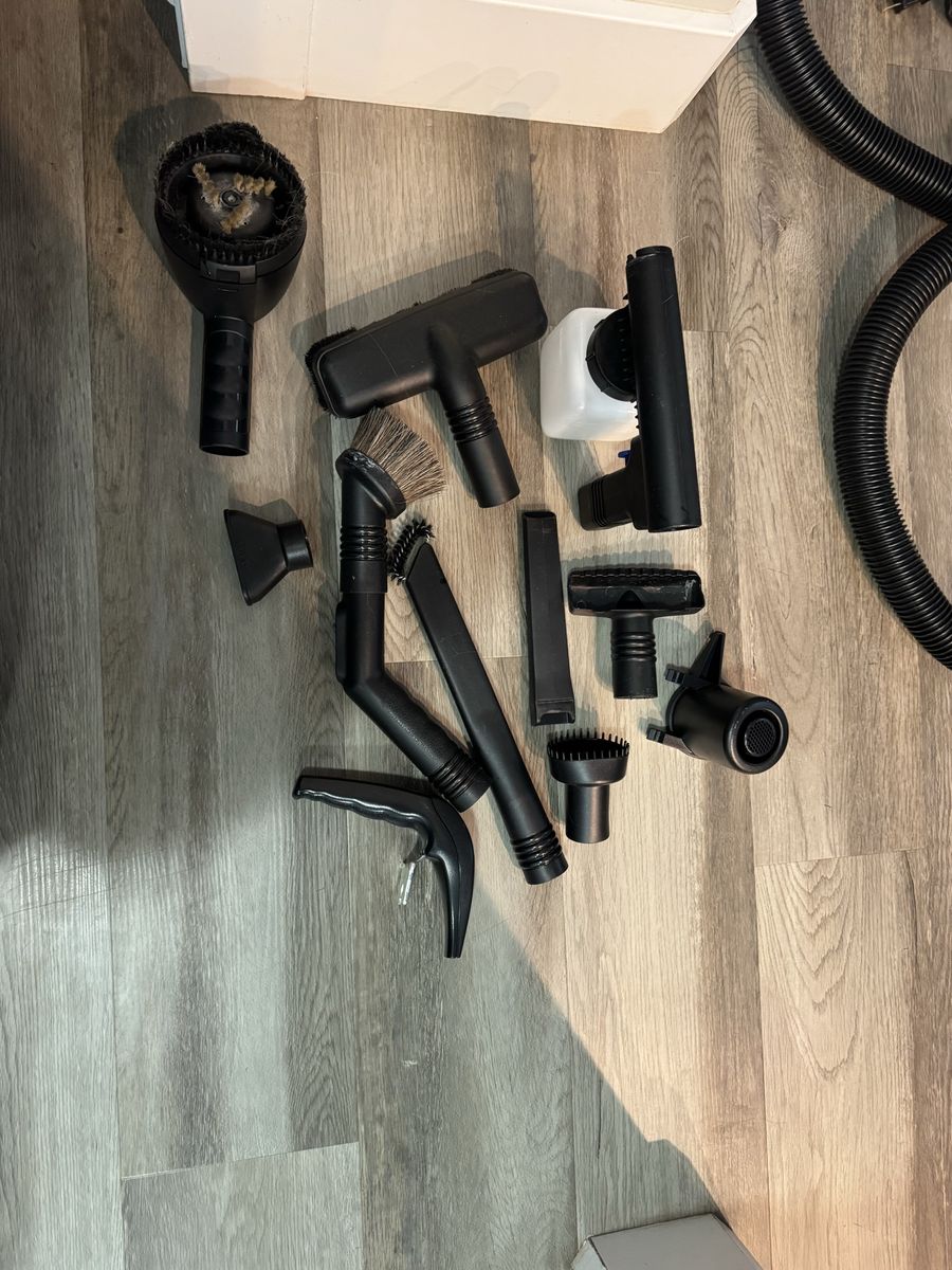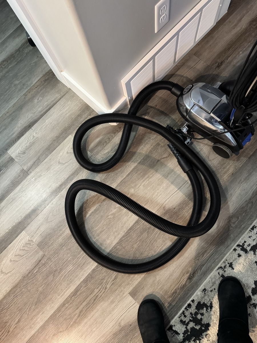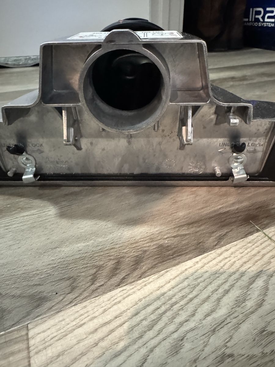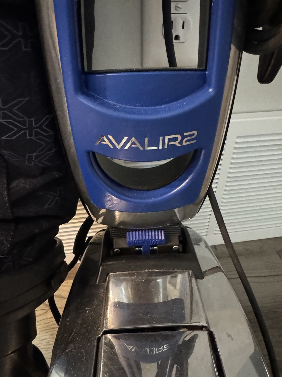 ZellePowerful Kirby Avalir 2 upright vacuum has a polished aluminum body with blue accents. This versatile cleaning system includes the main upright unit, a long flexible black hose, and the carpet shampooer/power nozzle head. It is a high-end corded model known for durability and deep cleaning capabilities. Has a small hole in hose attachemet (duct taped and works great) bought about a year ago. Price OBO