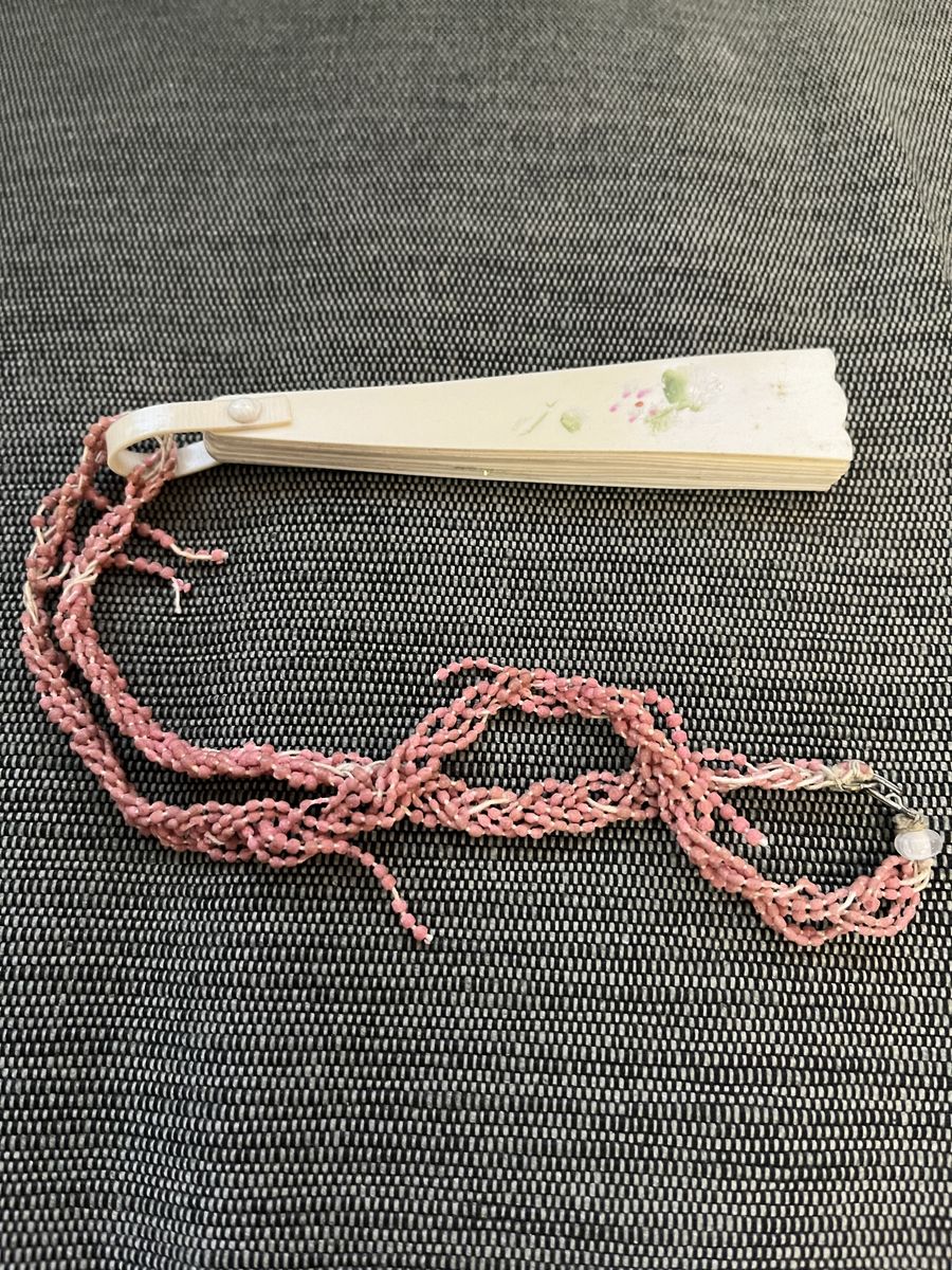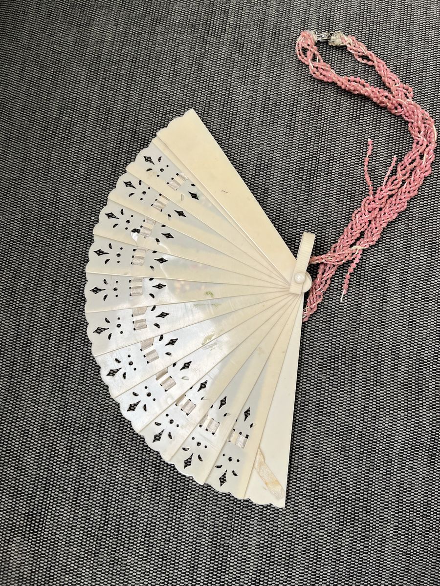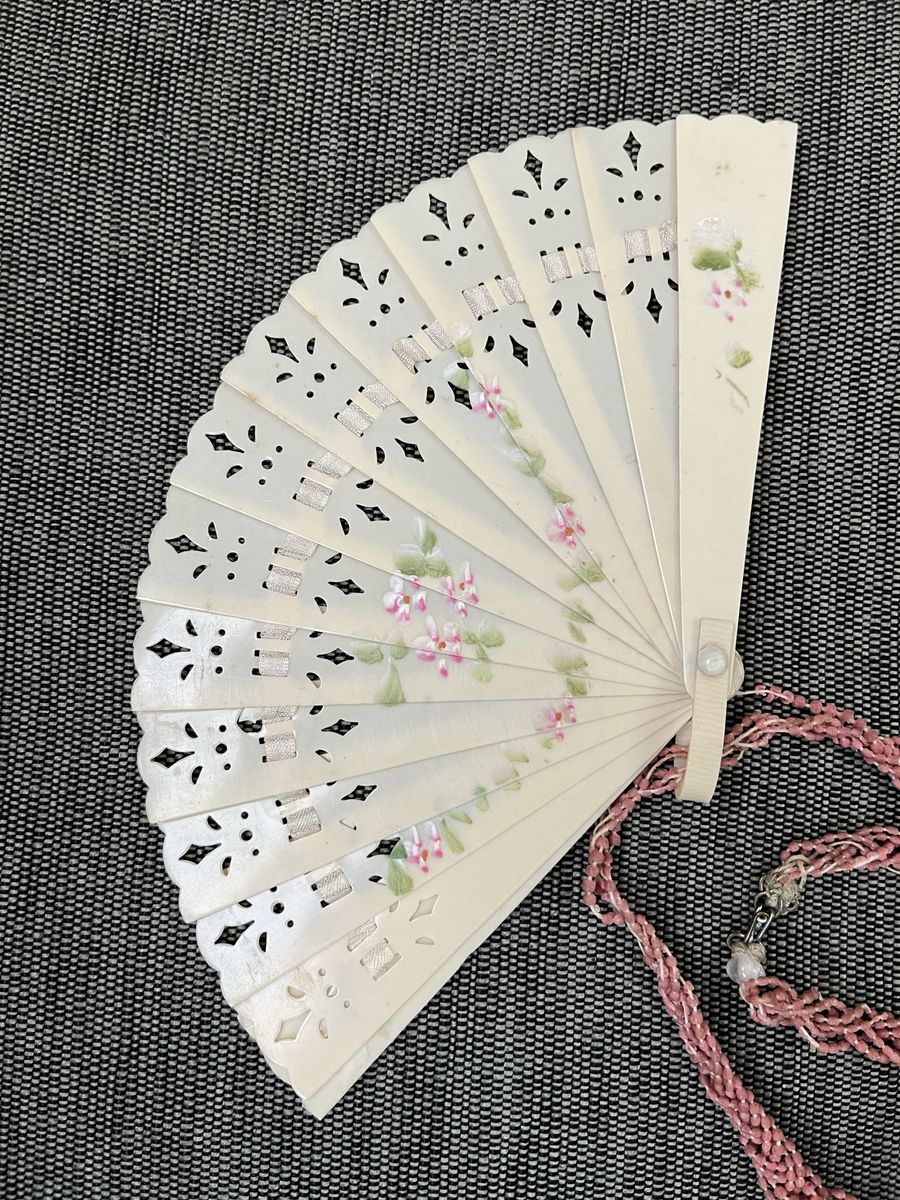 VenmoThis was made for a small child. It would look nice with a doll also. The fan part is only 4 inches, if you measure it with the loop on the end it is 4 1/2 inches. The fan works and is decorated with a pink and green flower pattern. It fans out and it folds up. The pink beads that a child would hold onto, are tired. Overall it is quite a unique piece of history. Bake Lite was popular in the 1920's and 1930's. Must see! Price is firm.