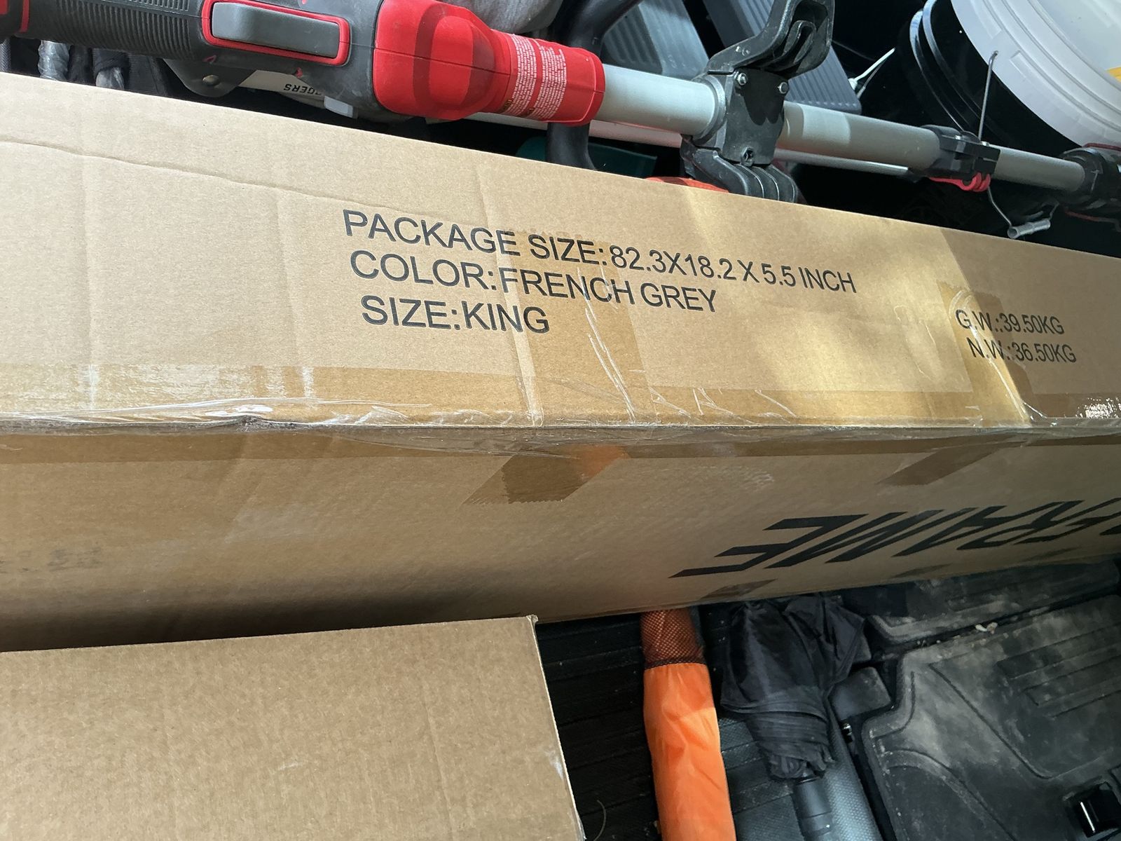 King size No box spring needed (platform design with slats) Heavy-duty metal frame Headboard & footboard included Under-bed clearance for storage Brand new in box