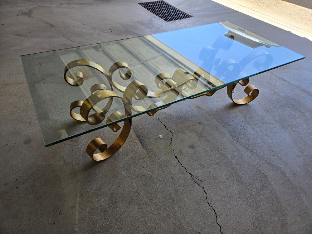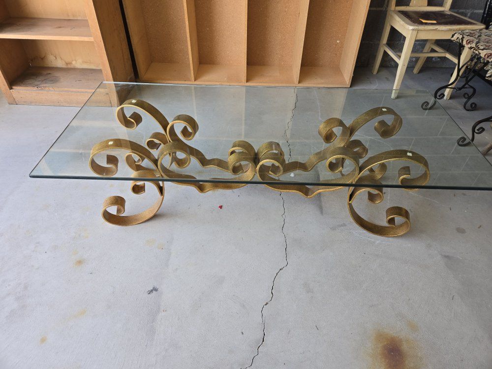 VenmoVintage wrought iron coffee table in amazing condition. Classic example of Hollywood Regency/Art Deco design, characterized by its ornate, gold-gilt wrought iron base and thick glass top. Glass top is in perfect condition with no scratches or cracks. Both pieces separate for easy transport. Heavy base and very thick glass.