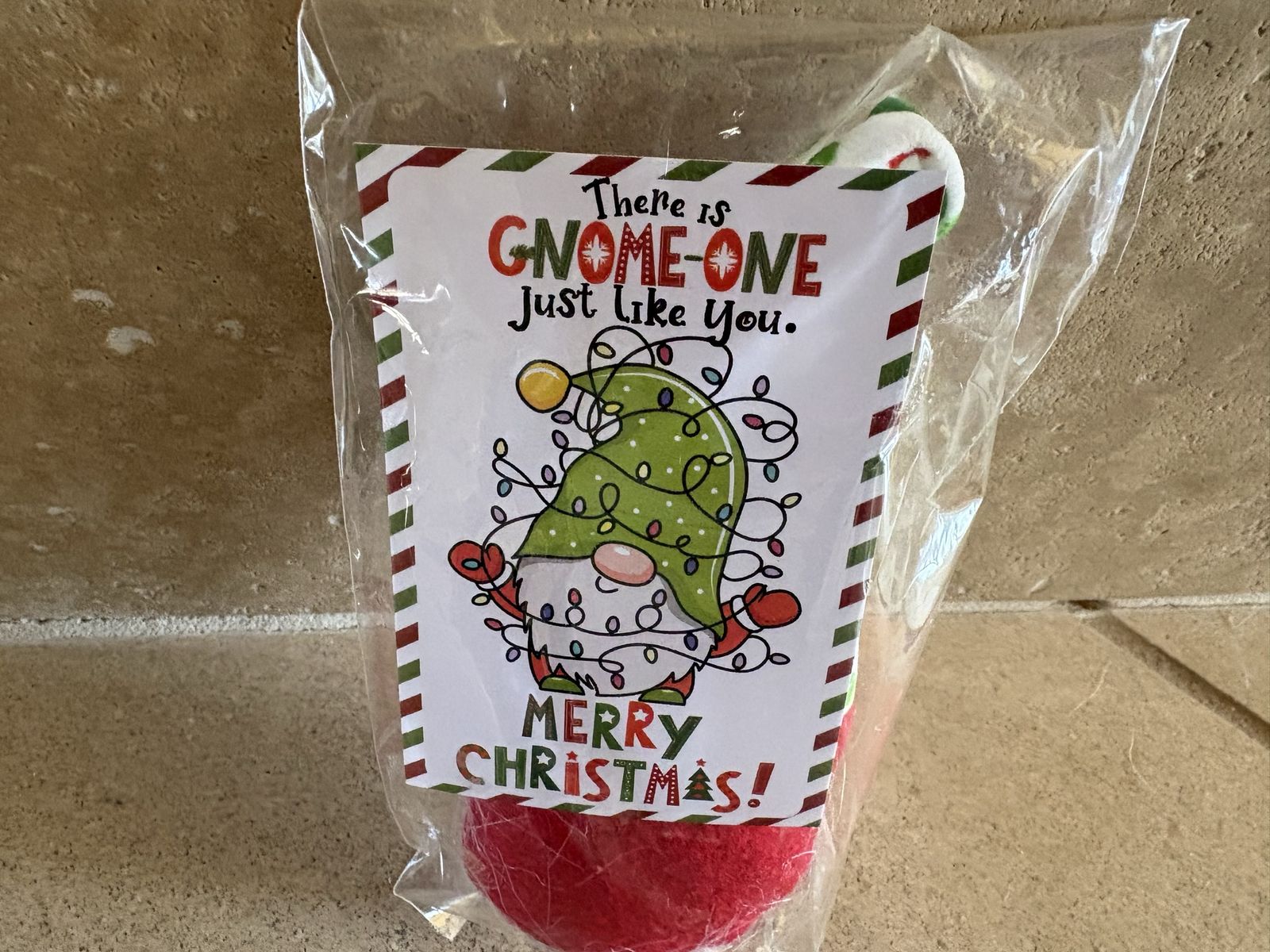 I have new cute little plush gnome ornament holding a sign that says There is Gnome-One Just Like You. There is also a Merry Christmas card or tag in the package that says the same thing. He is about 5 1/2 inches tall. See my other ads for jewelry, artwork, home decor and more.