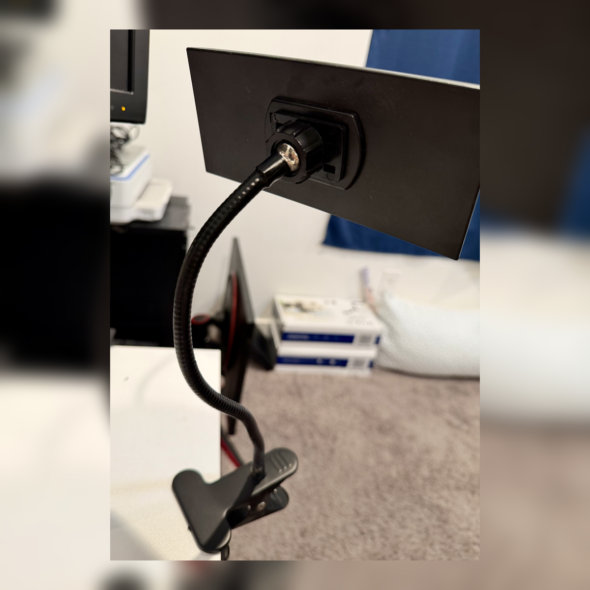 ZelleClip-on gooseneck mirror that's sturdy and in good condition. Includes just the mirror with clamp as shown. No visible defects.
