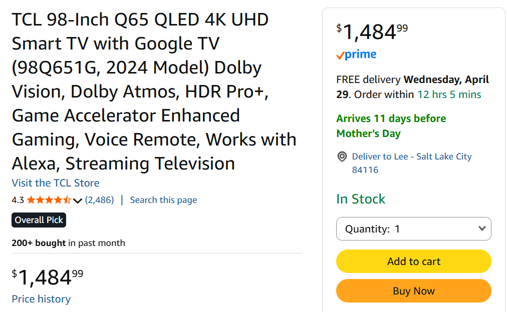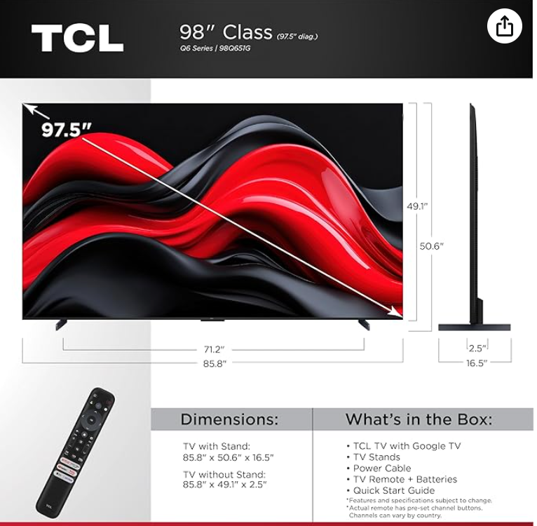 VenmoHUGE 98” QLED 4K SMART TV – BRAND NEW IN BOX Selling a 98-inch TCL QLED 4K Smart TV (2024 model). It’s brand new in the box. This thing is HUGE and would be amazing for movies, sports, or gaming. It has Google TV built in, Dolby Vision/Atmos, and all the smart features you’d expect. Super clear picture and great sound. It is for sale on Amazon for $1,484, so this is a really good deal if you’ve been looking for a big TV without paying full price. Message me if you’re interested