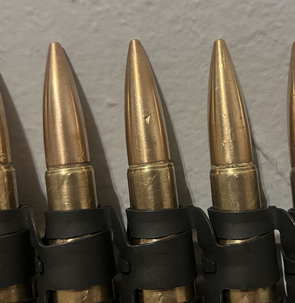 Holes drilled in one side of the brass only, the other side is not drilled. The projectiles have milsurp pull marks, but have been filed smooth and polished.
