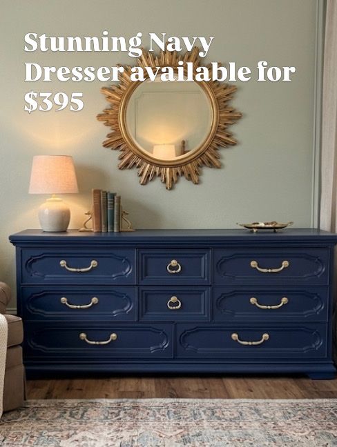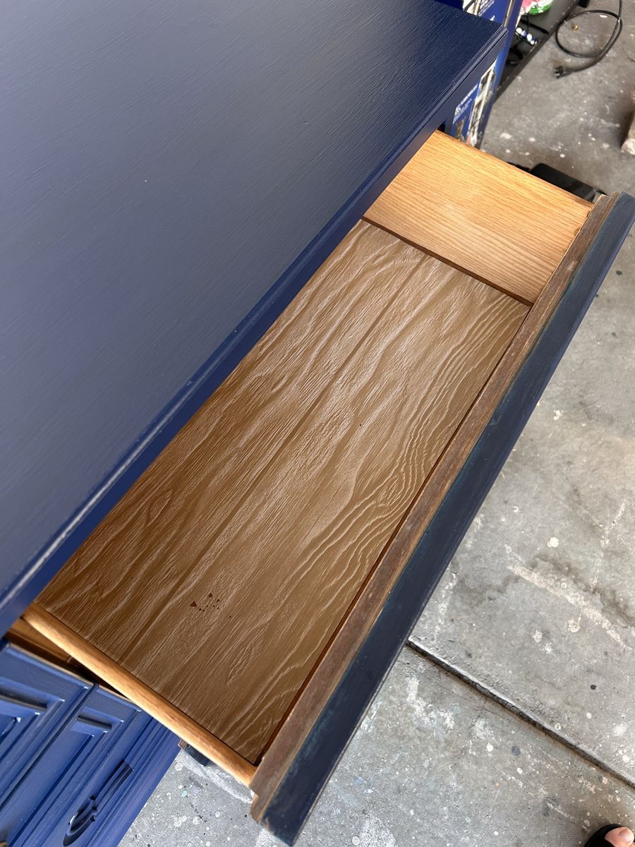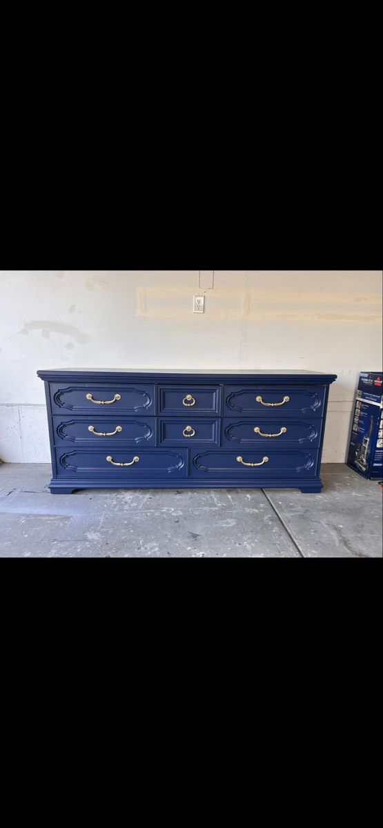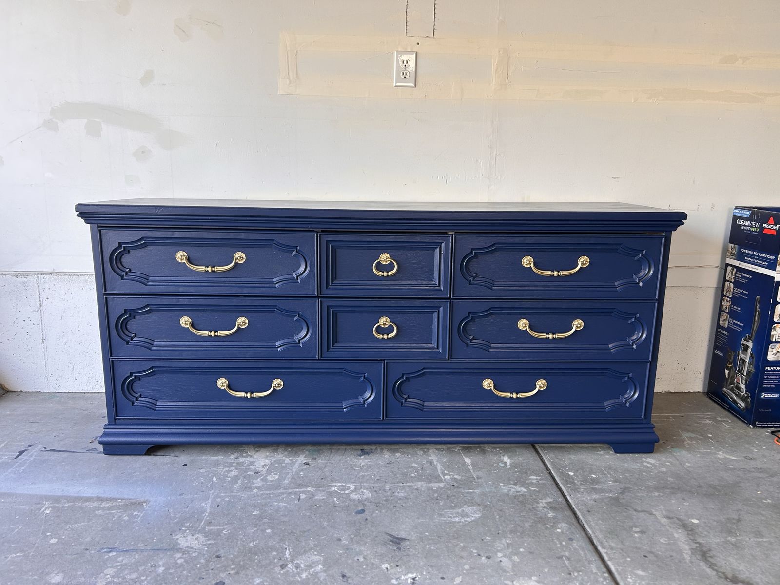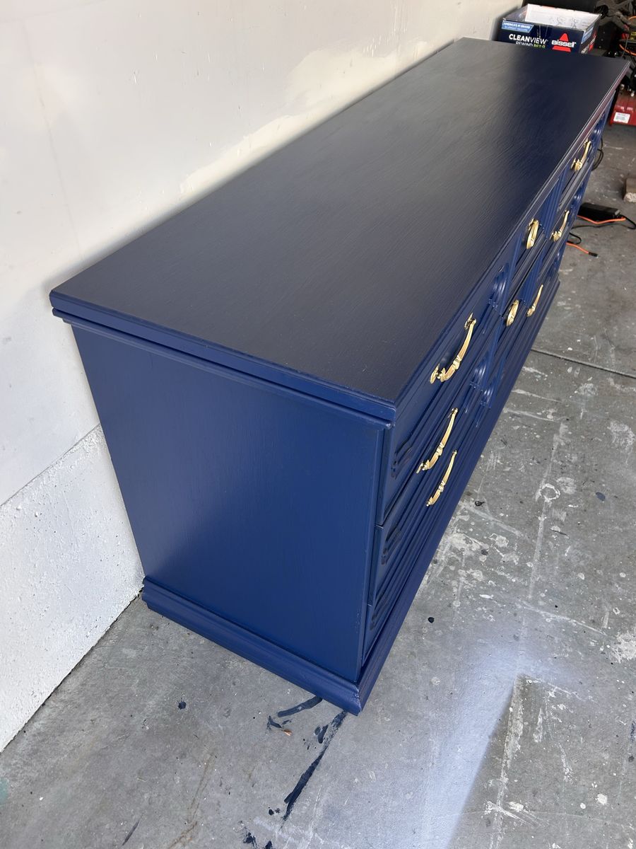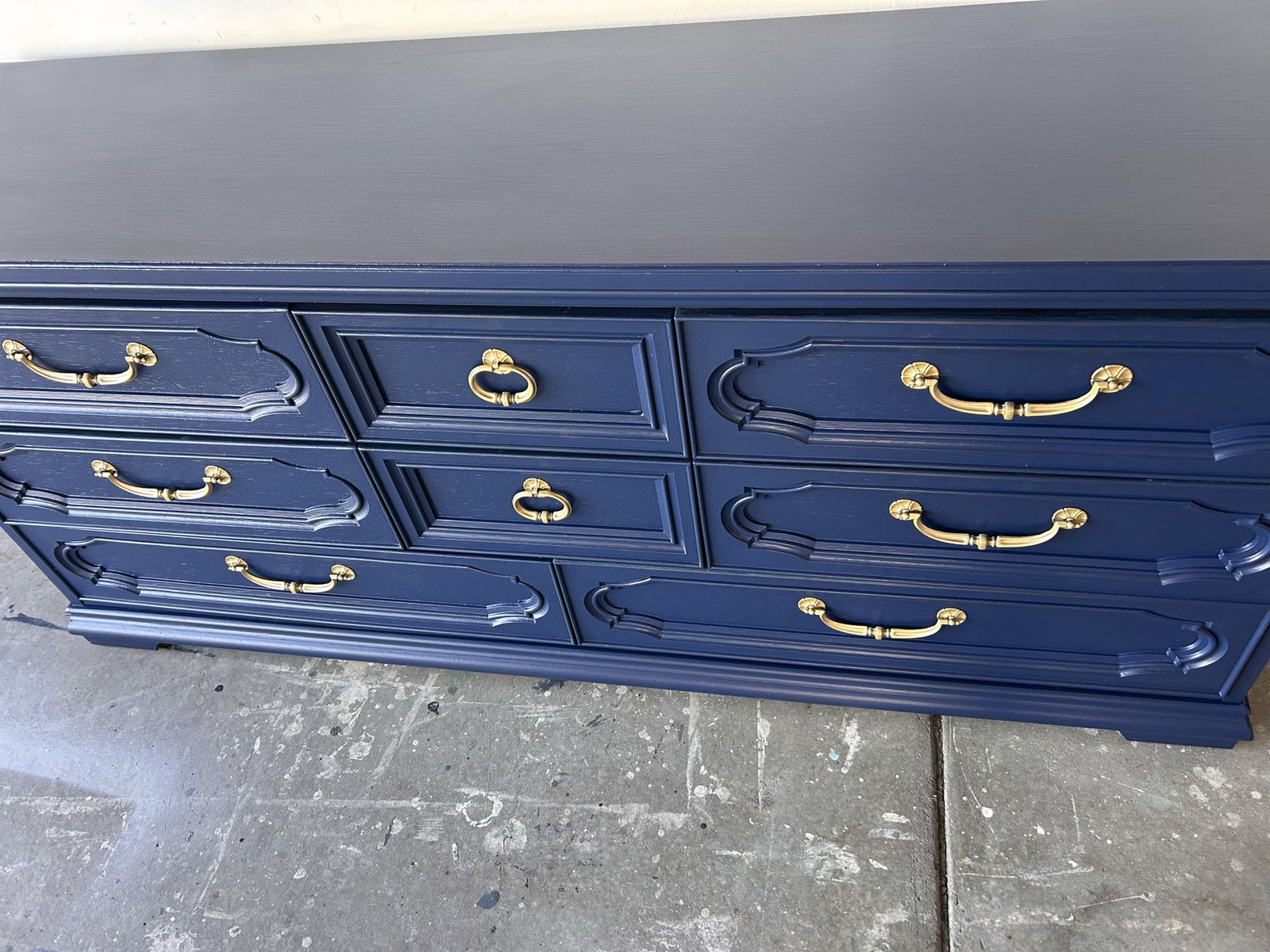 Eight drawer navy dresser. Just refinished in a gorgeous navy color. Made by John/Carpet furniture company. All original handles. 70” long 20” deep 31” tall FCFS CASH ONLY