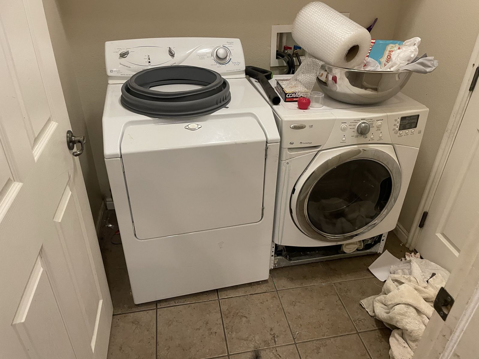 There is a washer and dryer in the unit that we are leaving. I do not know if the landlords will leave it in or not but we are not taking it with us. The rubber rim around the washing machine does need replaced. We have purchased the replacement rim but haven’t installed it yet.