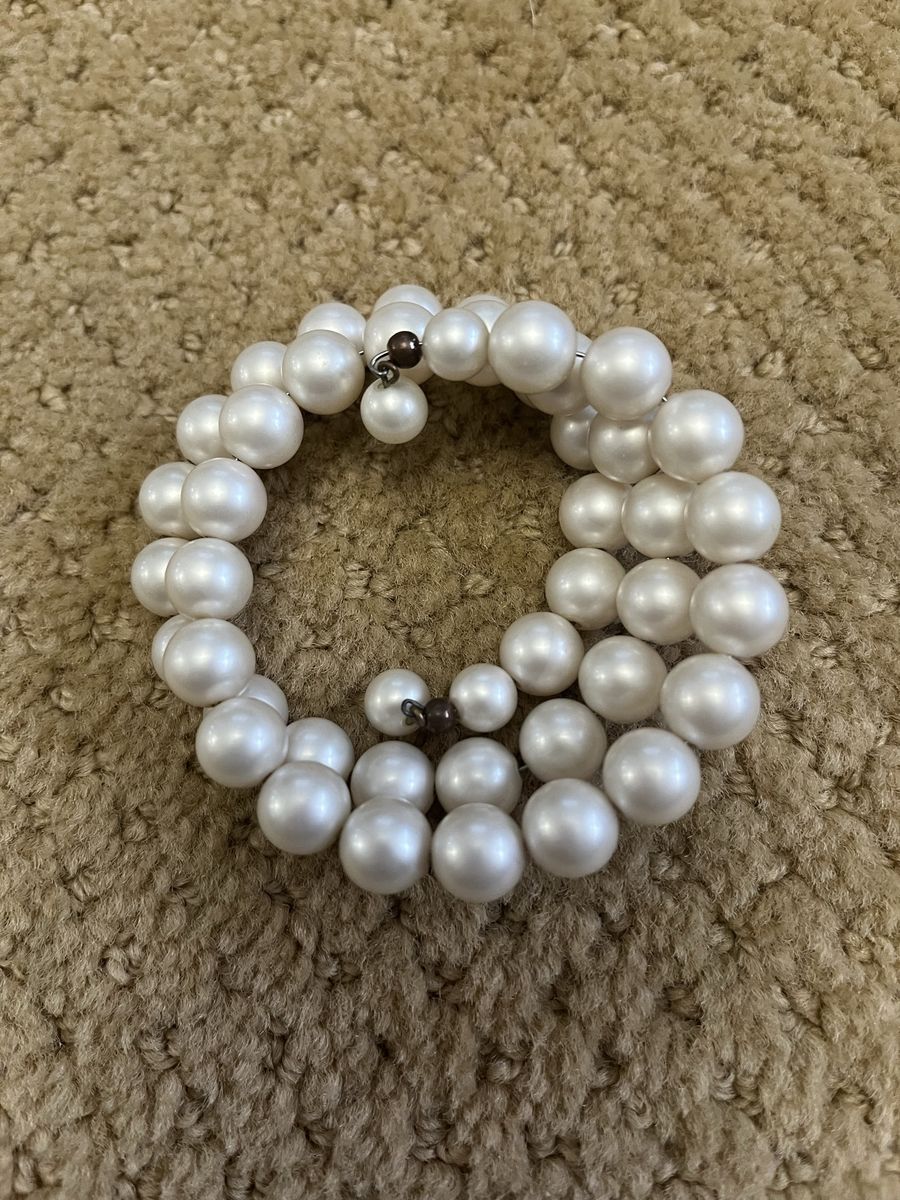 VenmoBuy vintage, you get better quality for less money. Plus the items are unique. This has the wonderful memory wire wrap around the pearls. It has a dangling bead at each end for extra detail. It is a triple strand look. It is an off white color. It's just a fun bracelet. Selling to help a parent.