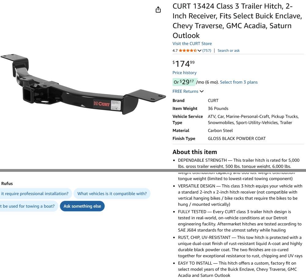 Curt brand Class 3 Trailer hitch. 2 inch receiver. Never been installed, Fits selected Buick Enclave, Chevy Traverse, GMC Acadia, Saturn Outlook.