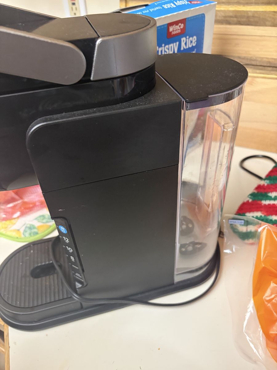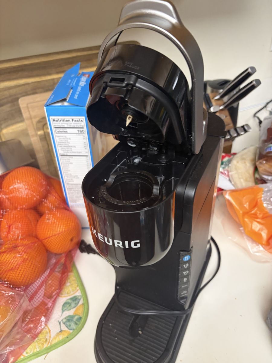 Clean black Keurig single serve coffee maker. Has a water reservoir on the side. Makes coffee in 8, 10, or 12 ounce sizes, also has a shot and iced option. Works great just don’t use it often enough.