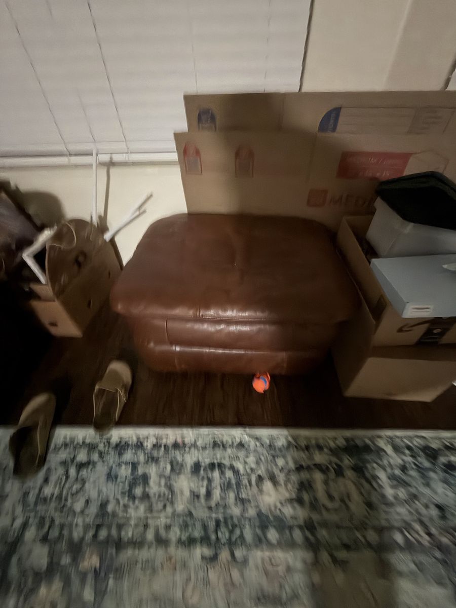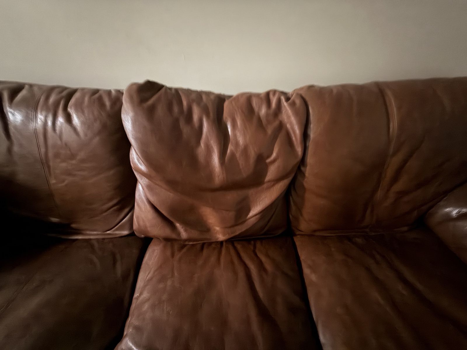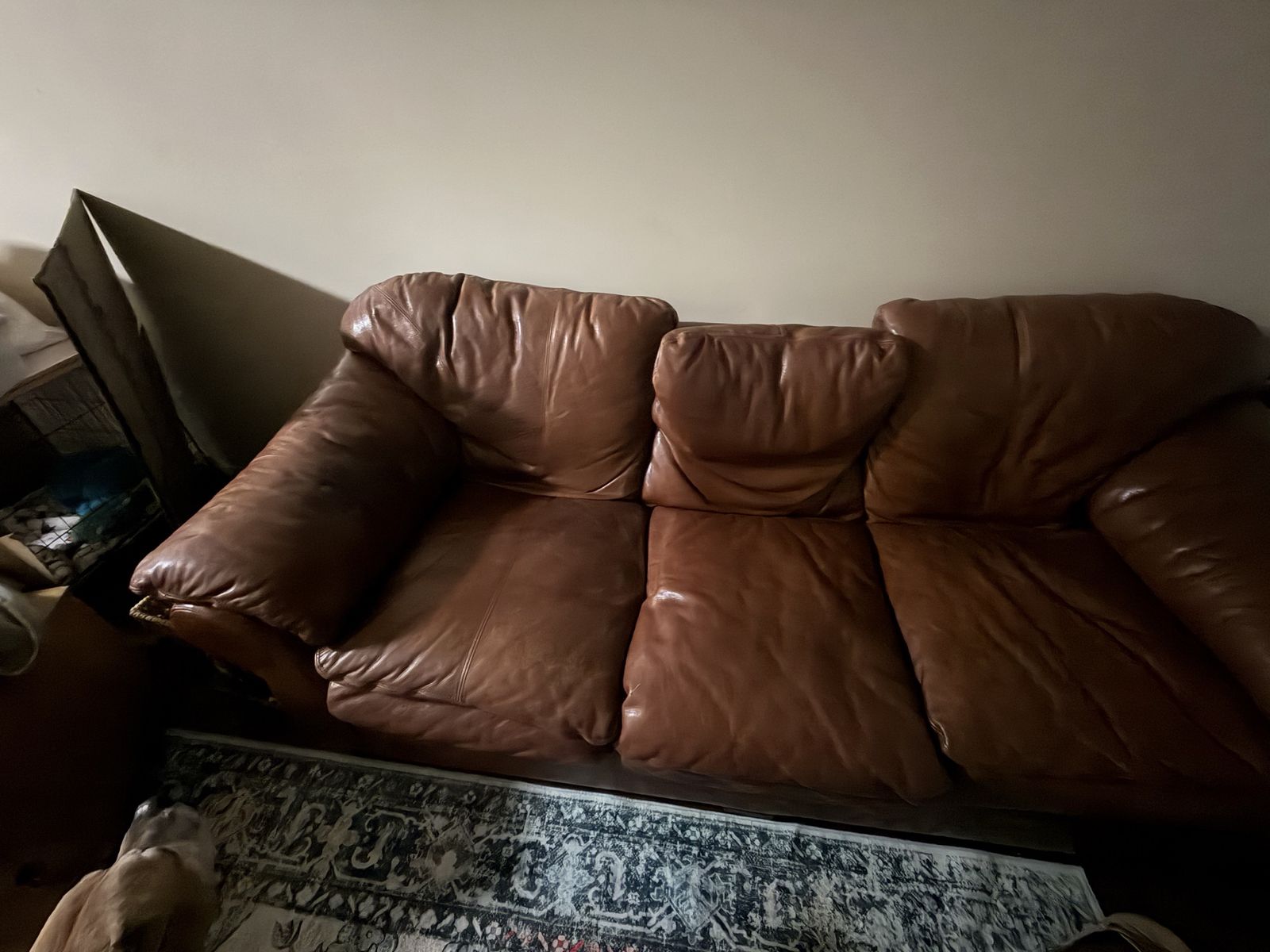 Priced to sell! Comfy brown leather sofa and ottoman set. Real leather, worn in nicely. Great for lounging. Sofa has three seats. Ottoman matches. Could use a good clean. Cushions are removable Pick up evenings or weekends. Need gone by 5/11
