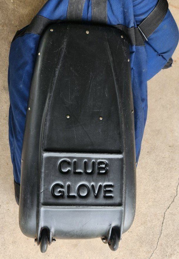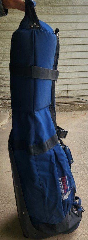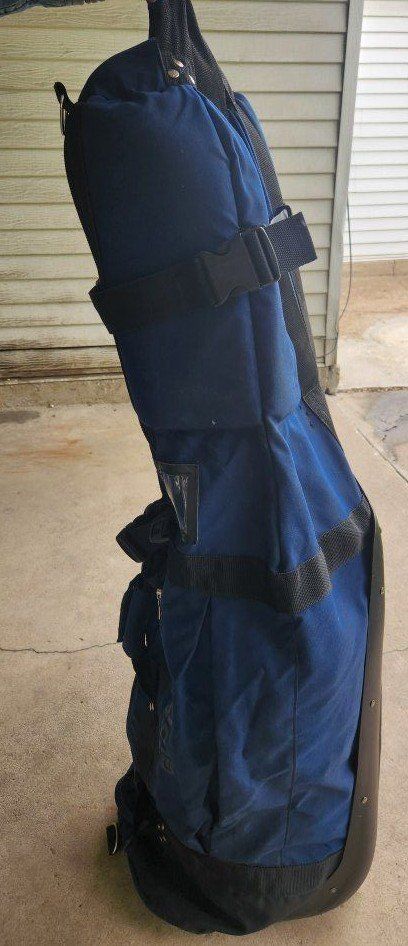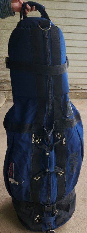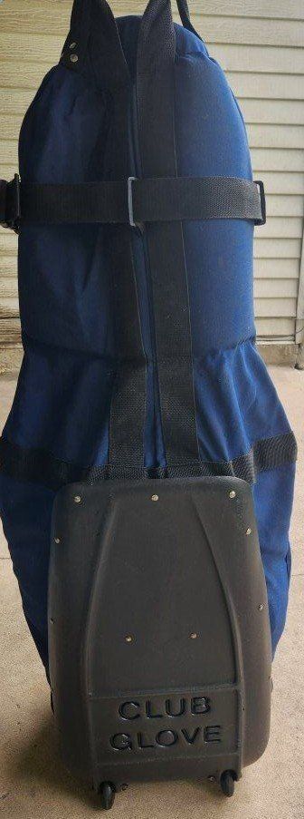 golf travel bag, club glove, blue, black padded all zippers work no tears, rips excel cond